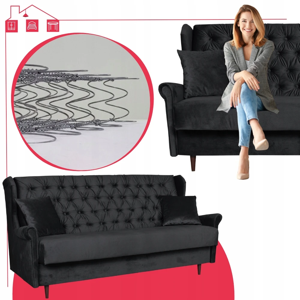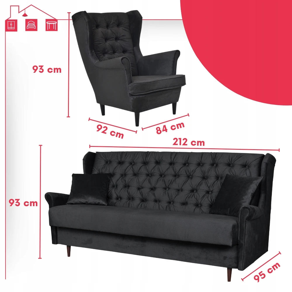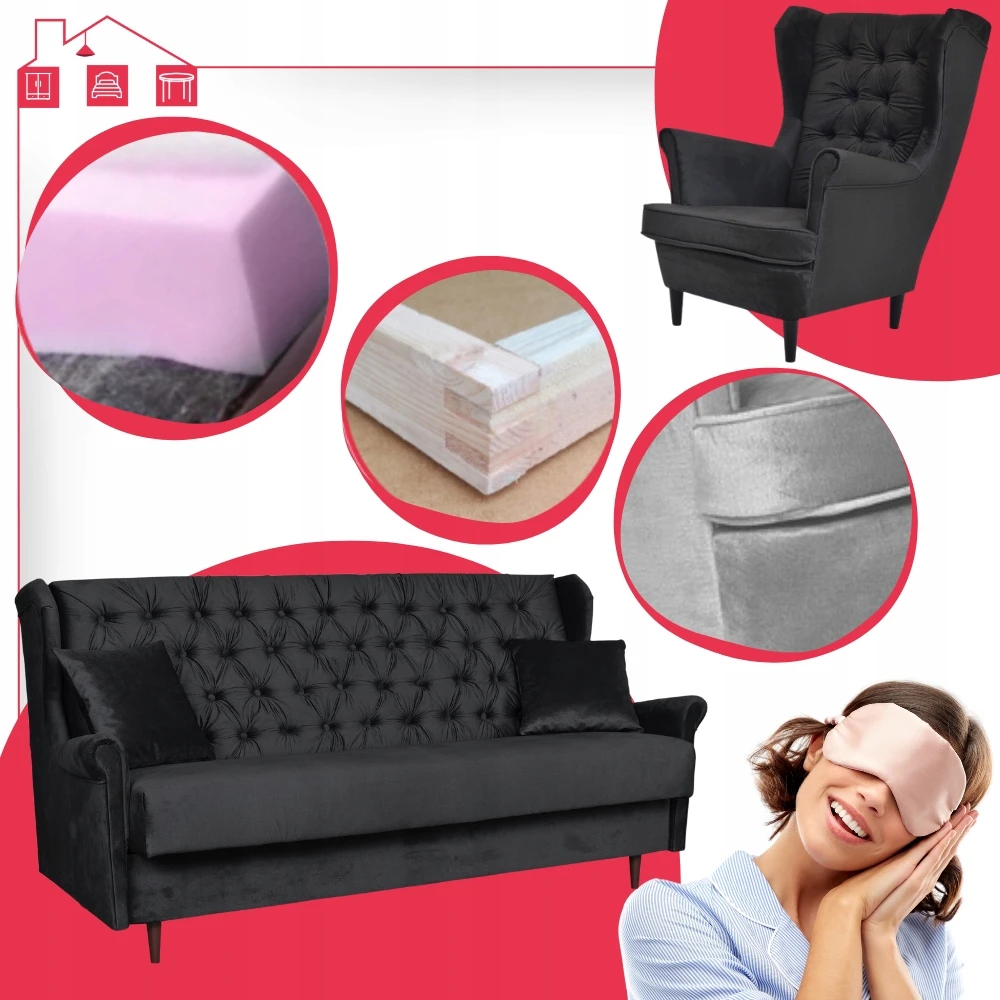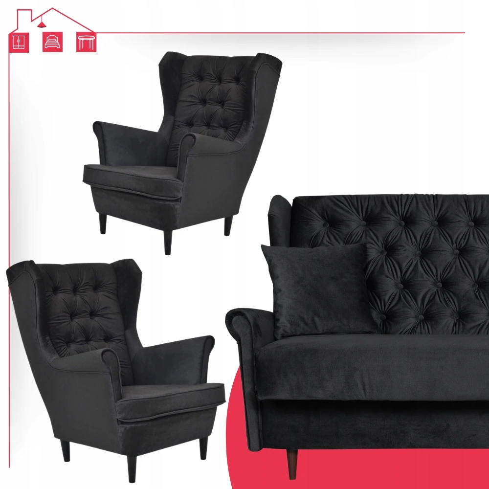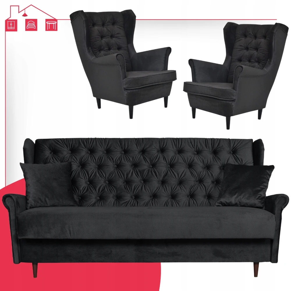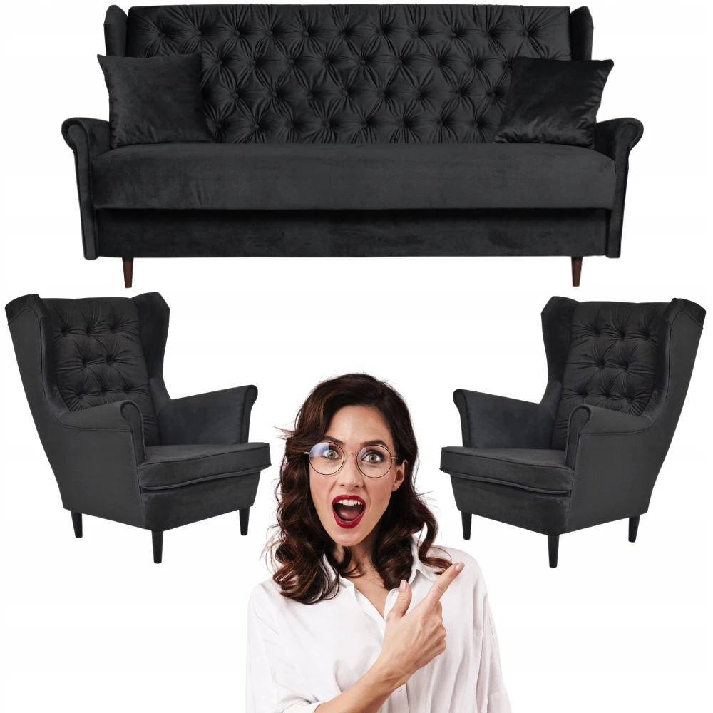 CZARNY zestaw wypoczynkowy welurowy USZAK wersalka z fotelami Family Meble