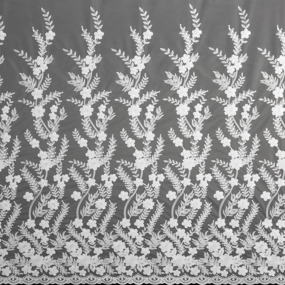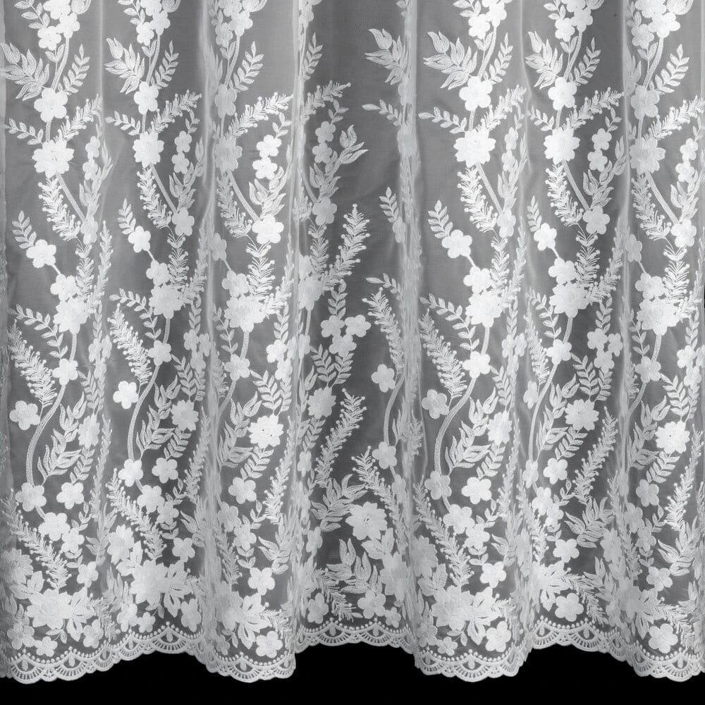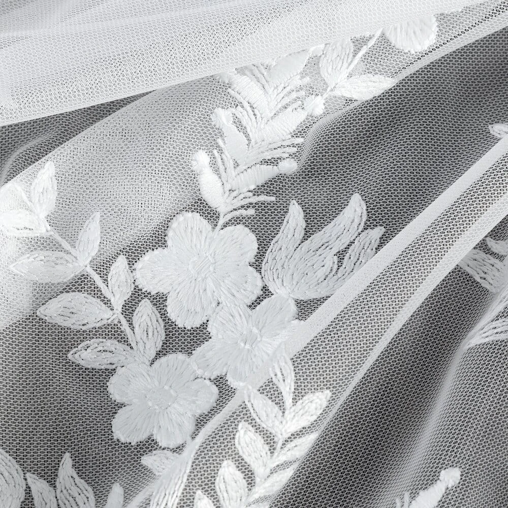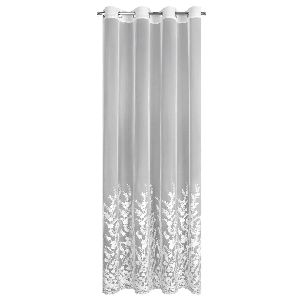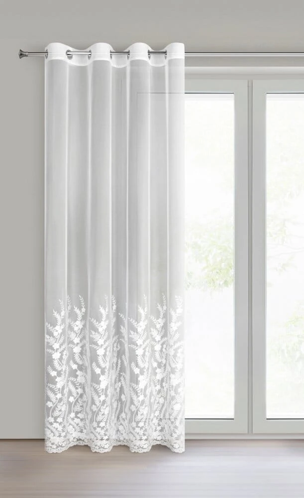 Uszyta z lekkiego i zwiewnego materiału typu siateczka, delikatnie przepuszcza światło, nadając wnętrzu jasności i subtelnej elegancji. Haftowane zdobienia w postaci subtelnych kwiatowych motywów roślinnych, dodają firanie wyjątkowego charakteru i nuty naturalnej lekkości. Uniwersalna biel sprawia, że doskonale komponuje się zarówno z nowoczesnymi, jak i klasycznymi aranżacjami.