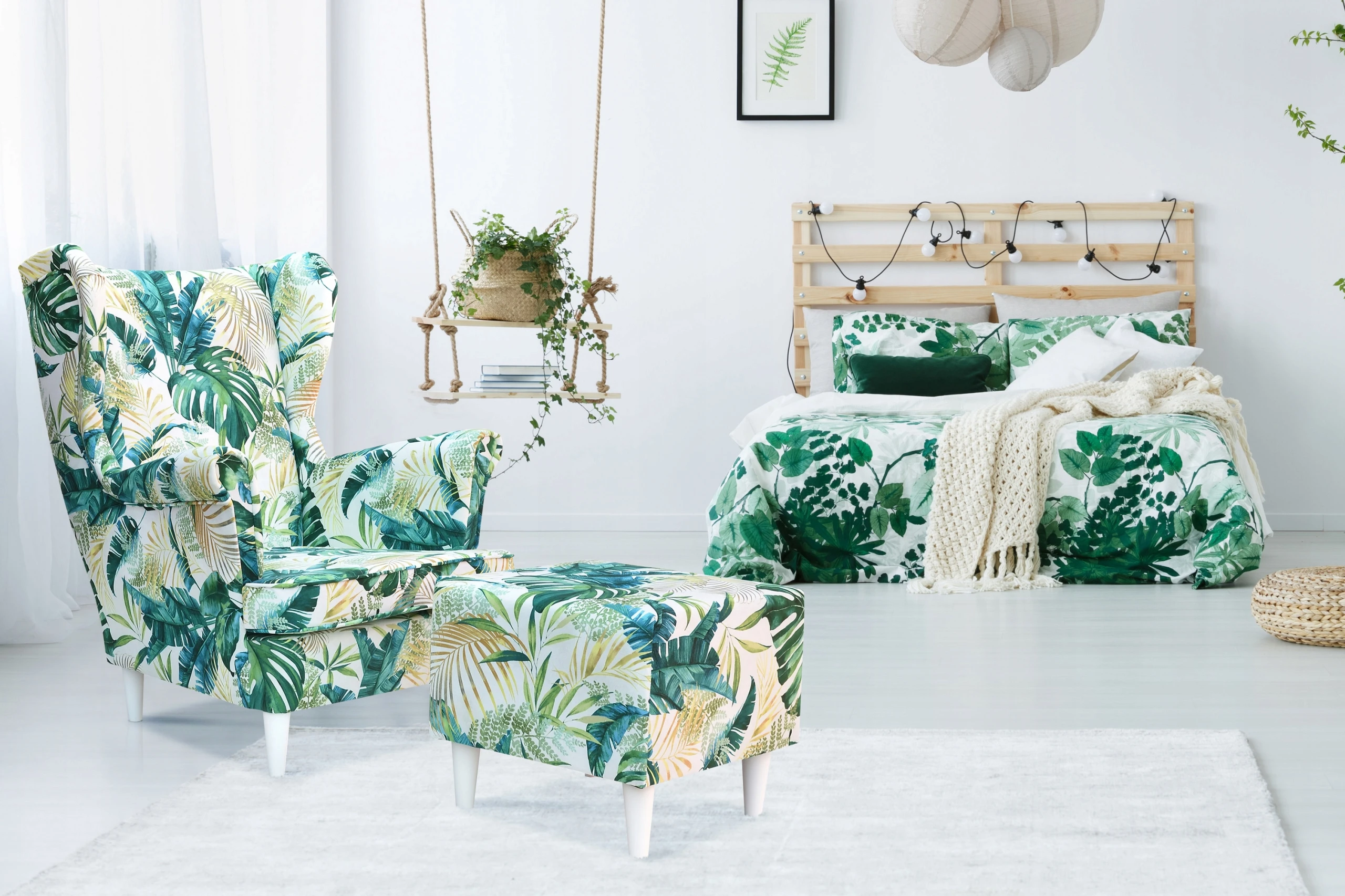 Fotel, którego dotyczy aukcja, wykonany został w tkaninie GARDEN 2. Przedstawia ona ptaki, liście, motyle czy też małpki na jasnym tle. Dzięki niejednolitej grafice ewentualne zabrudzenia są mniej widoczne.