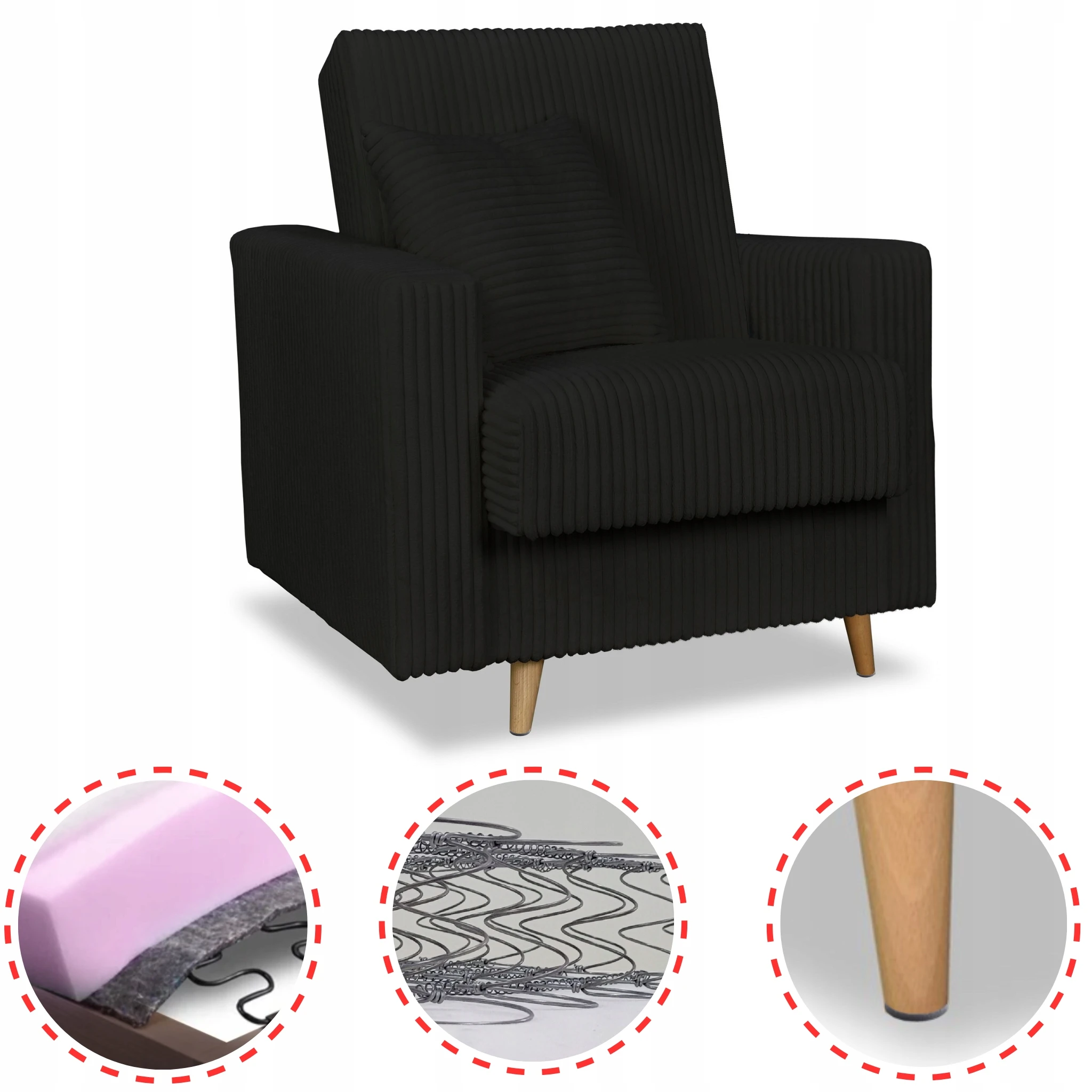 Oferowany fotel został wyposażony w wysoki materac wypełniony sprężynami typu Bonell.