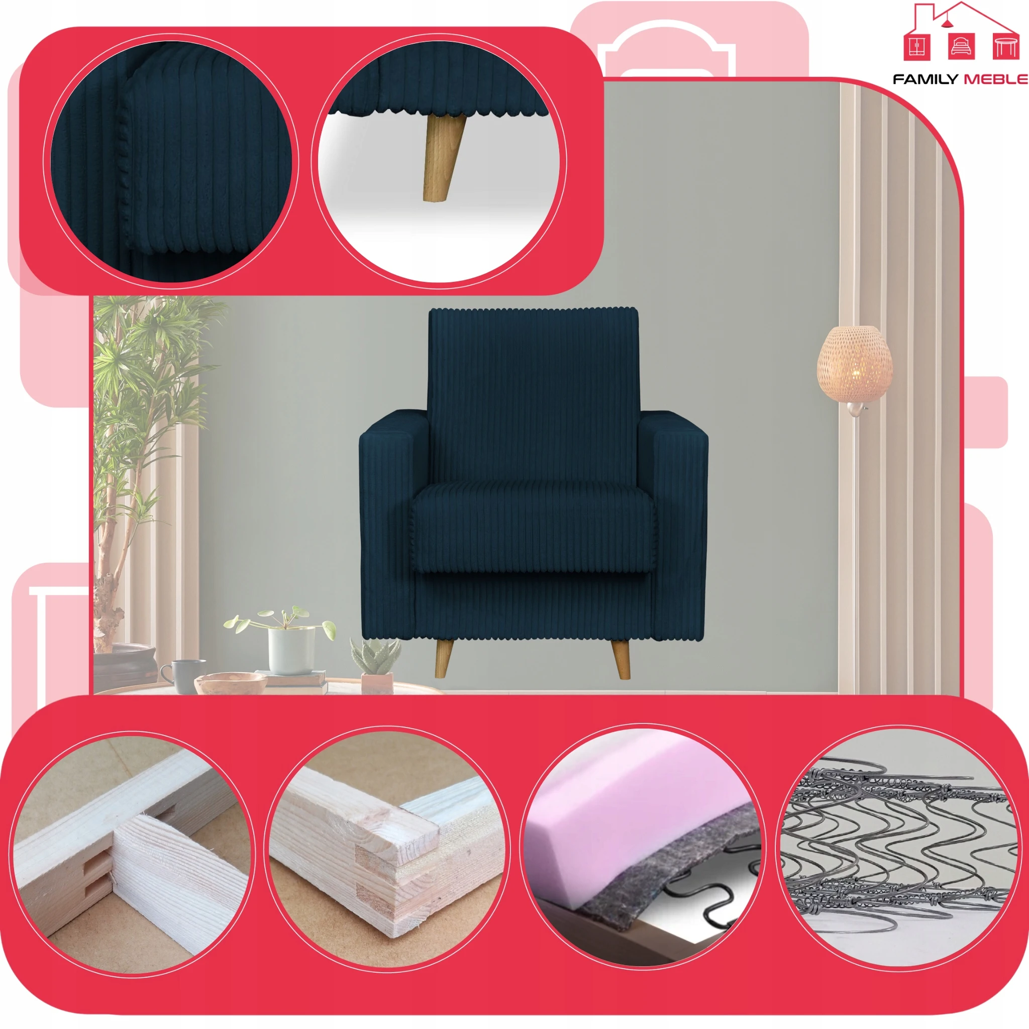Oferowany fotel został wyposażony w wysoki materac wypełniony sprężynami typu Bonell.