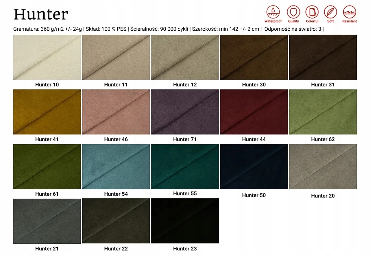 - Materiał: Welur HUNTER – miękki, przyjemny w dotyku, mięsisty i łatwy w utrzymaniu czystości. Tkanina jest przyjazna zwierzętom i odporna na codzienne użytkowanie, wykazuje także zwiększoną odporność na zadrapania.