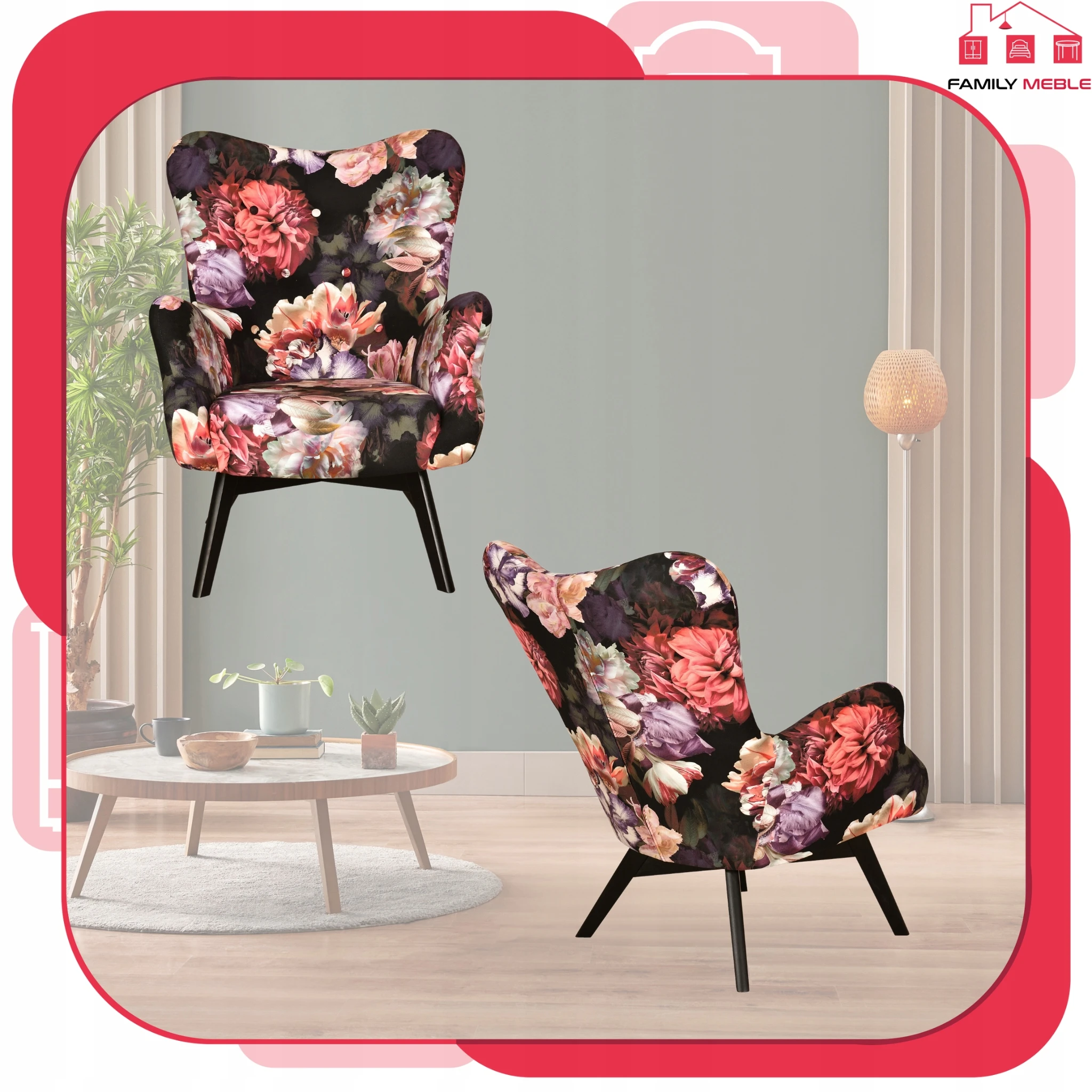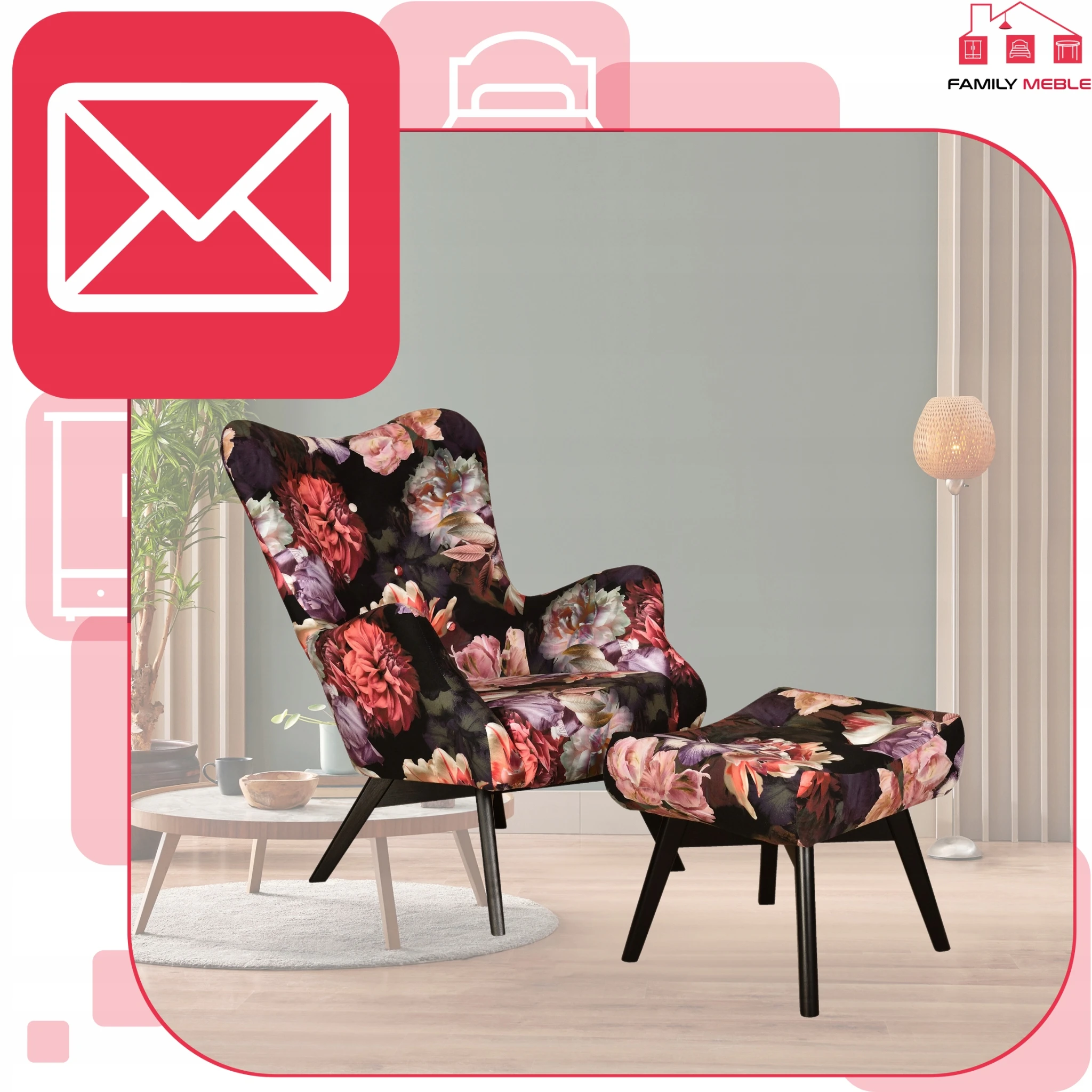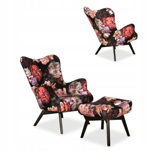 Fotel skandynawski Luna Print z podnóżkiem pufą Family Meble kwiaty piwonie