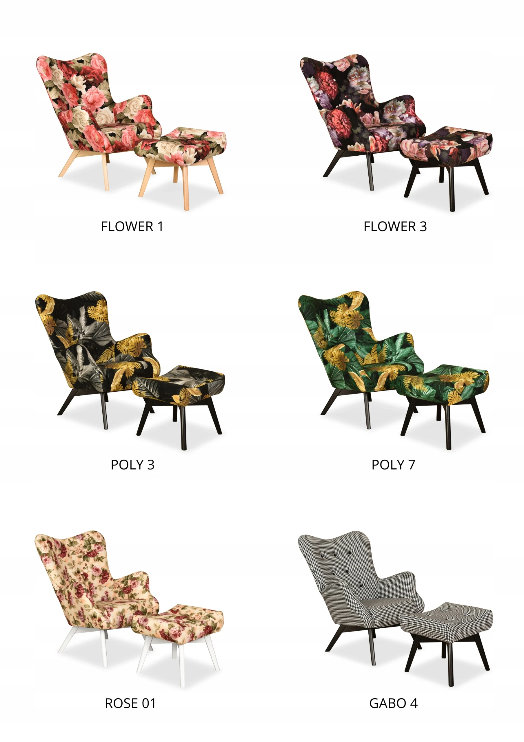 Wzory drukowane są na tkaninach welurowych i plecionkach. W skład kolekcji wchodzą wielobarwne motywy kwiatów. Fotel obity w tak efektowny wzór z pewnością ożywi każde wnętrze.