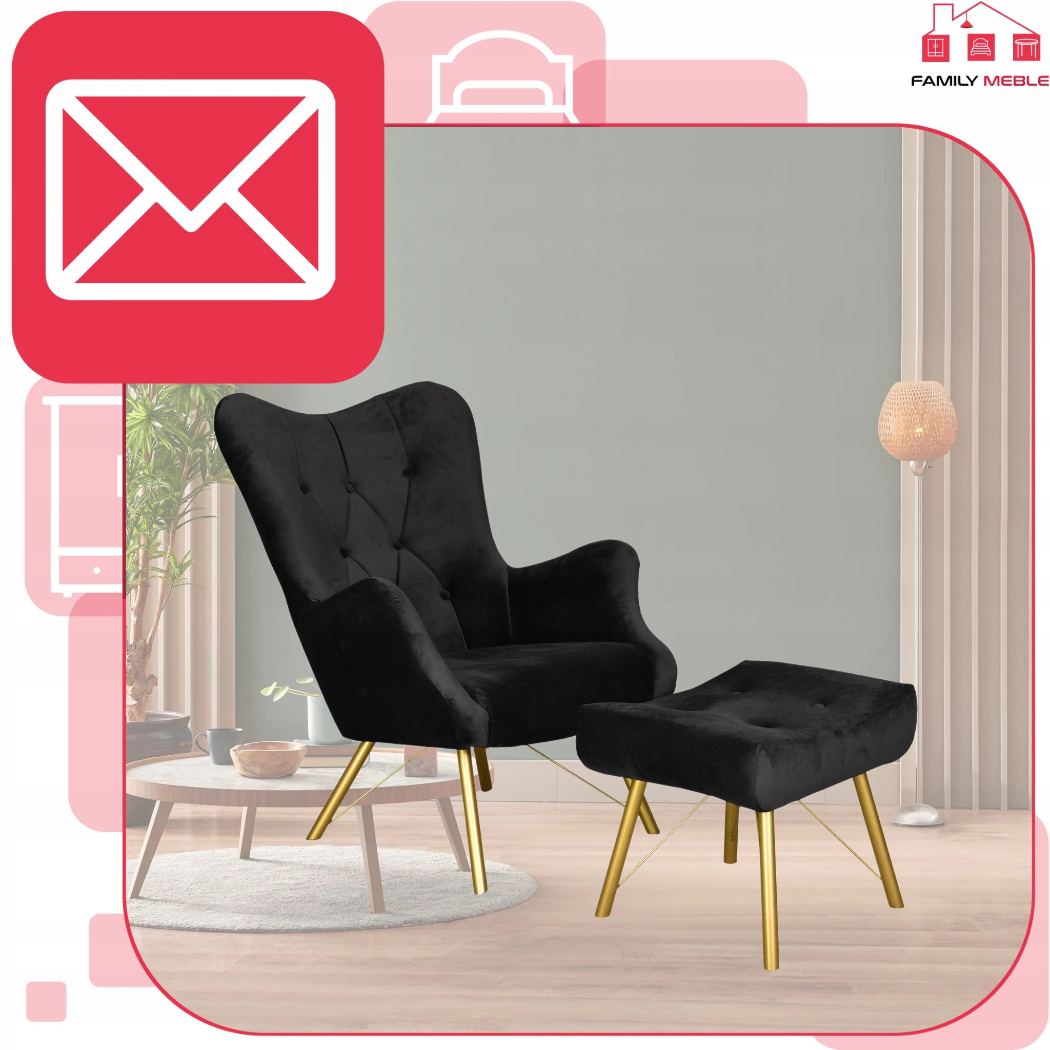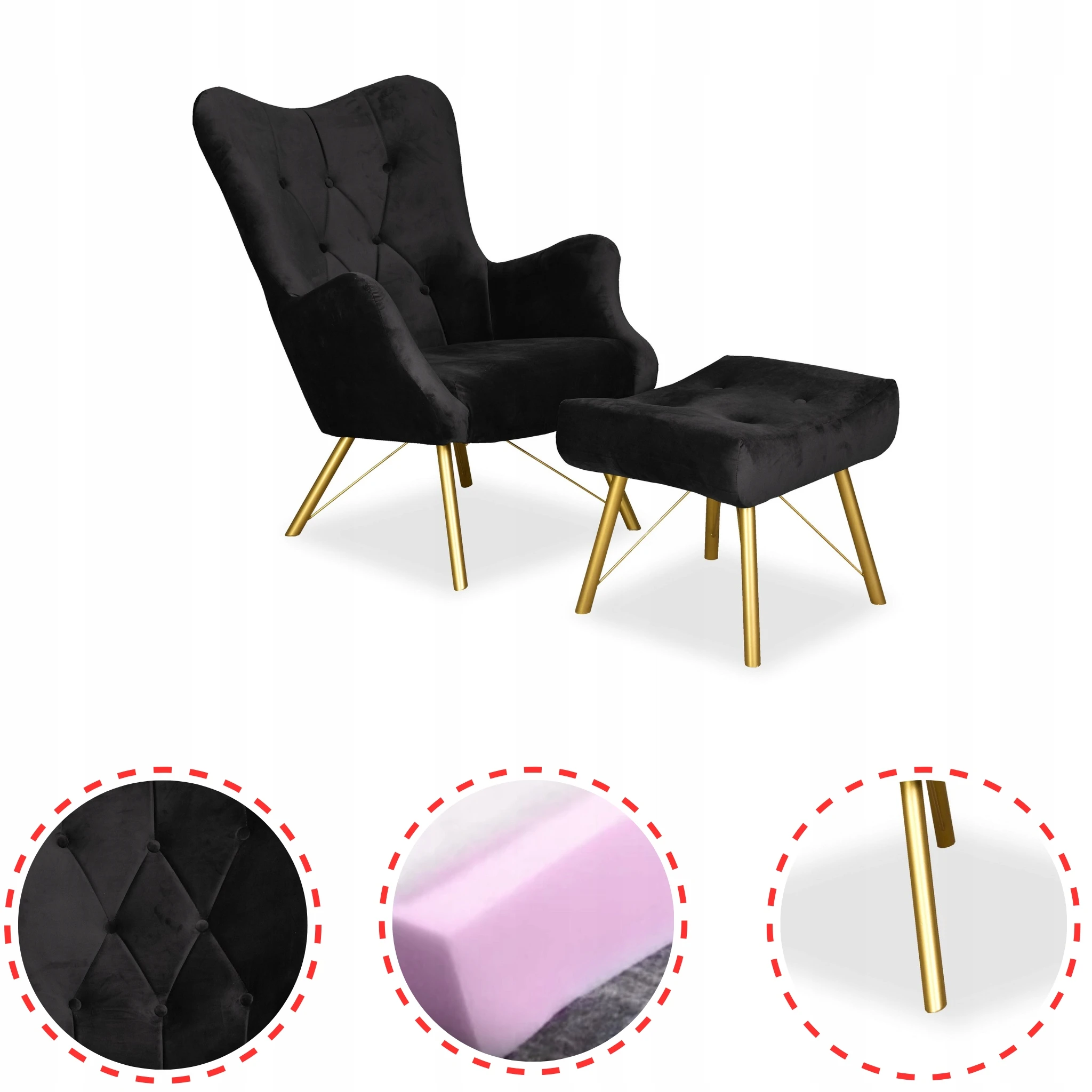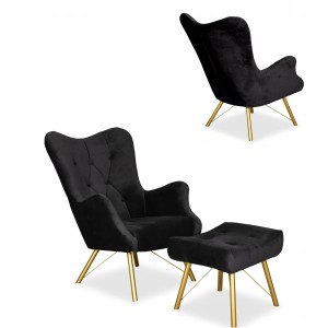 Fotel skandynawski Luna z podnóżkiem pufą guzik Family Meble czarny welur