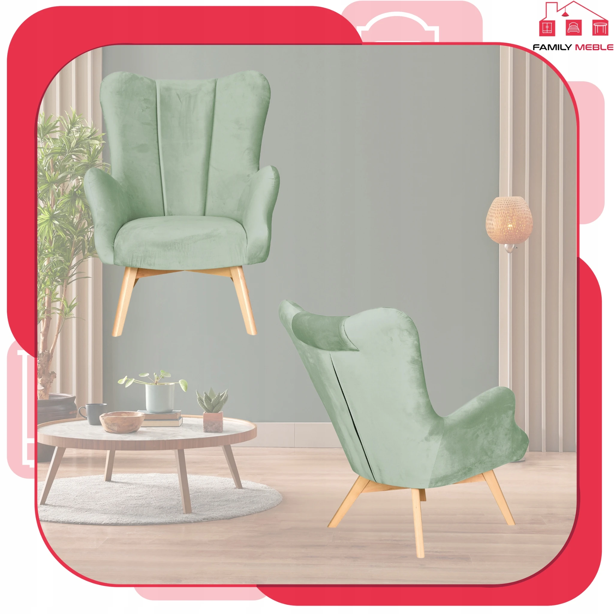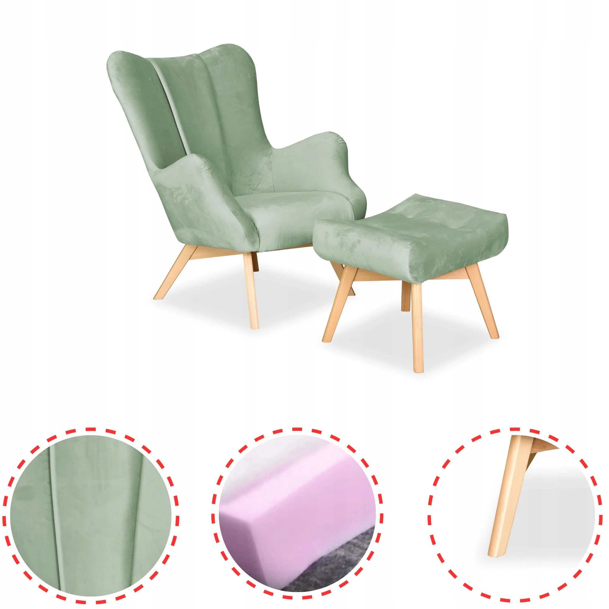 Fotel skandynawski Vika z podnóżkiem pufą profilowany Family Meble miętowy