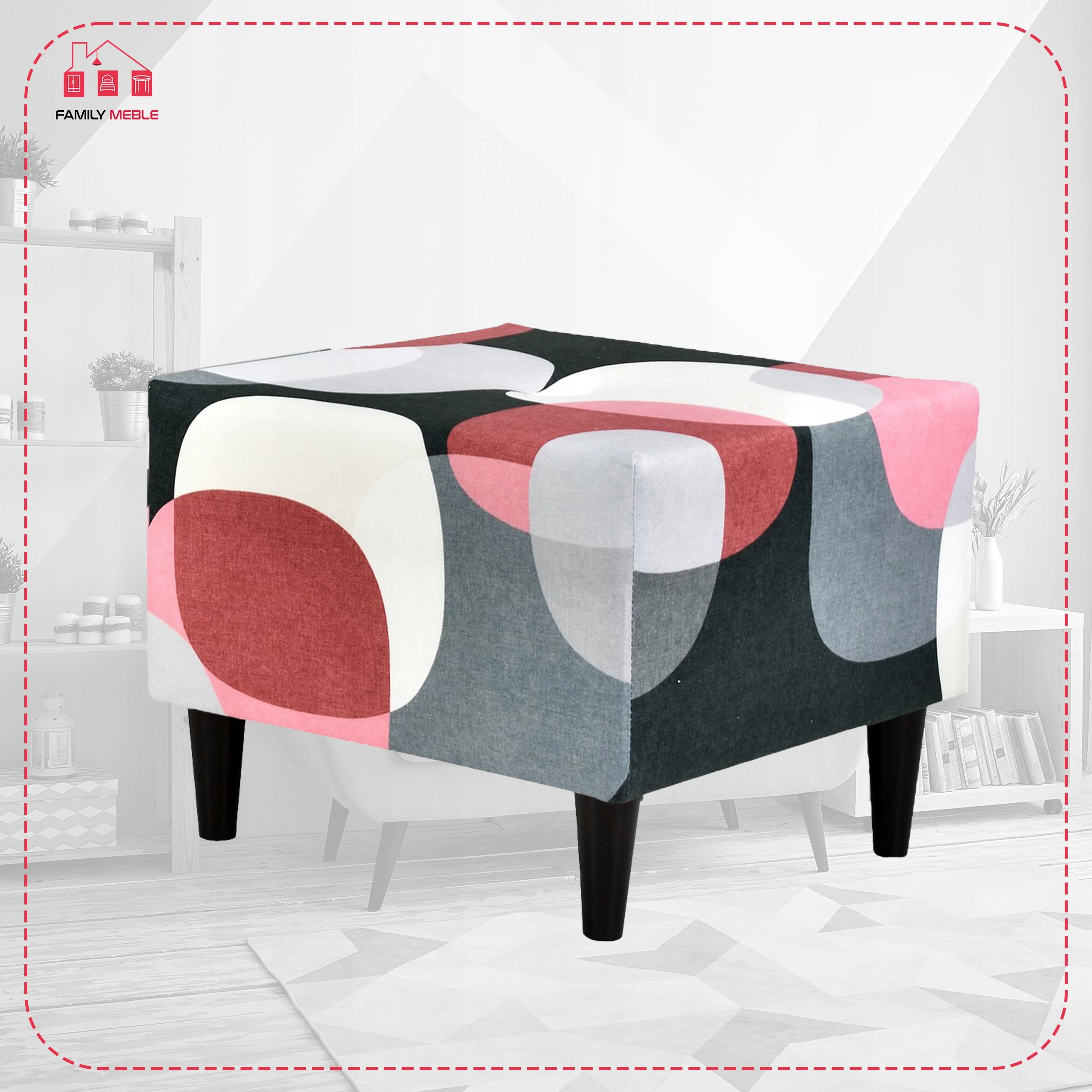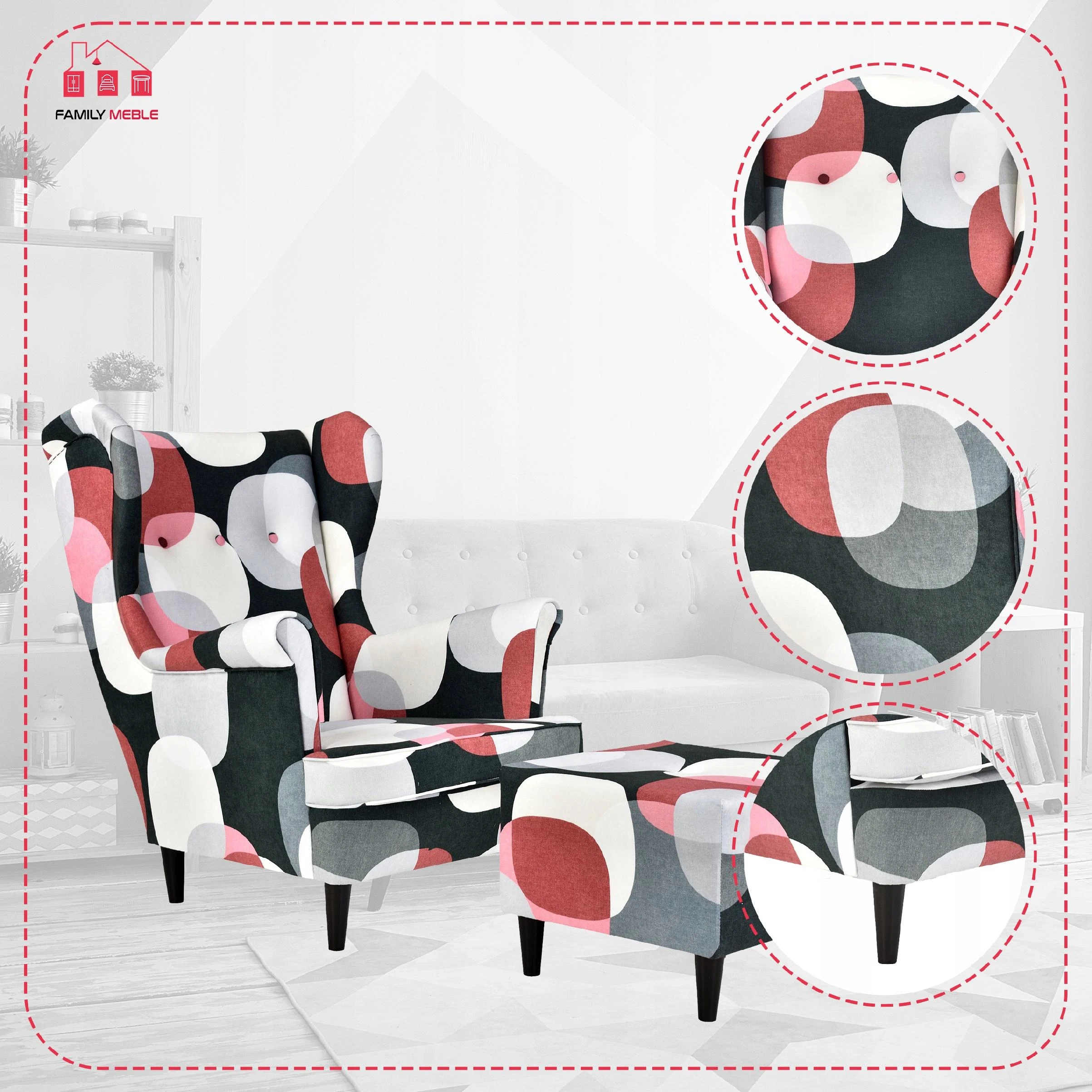 Fotel uszak ARI PRINT z podnóżkiem, skandynawski Family Meble groszki