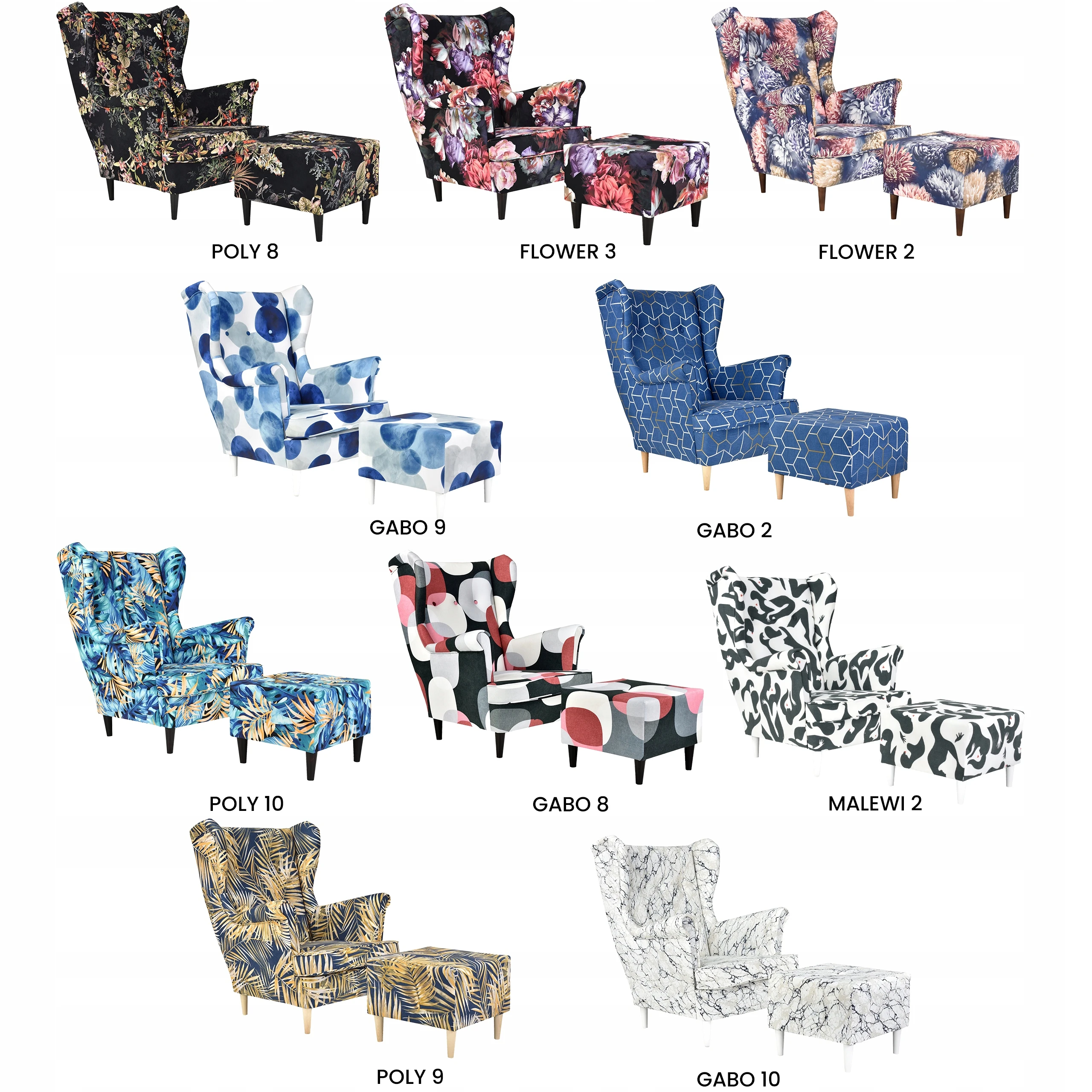 Wzory drukowane są na tkaninach welurowych i plecionkach. W skład kolekcji wchodzą wielobarwne motywy kwiatów. Fotel obity w tak efektowny wzór z pewnością ożywi każde wnętrze.