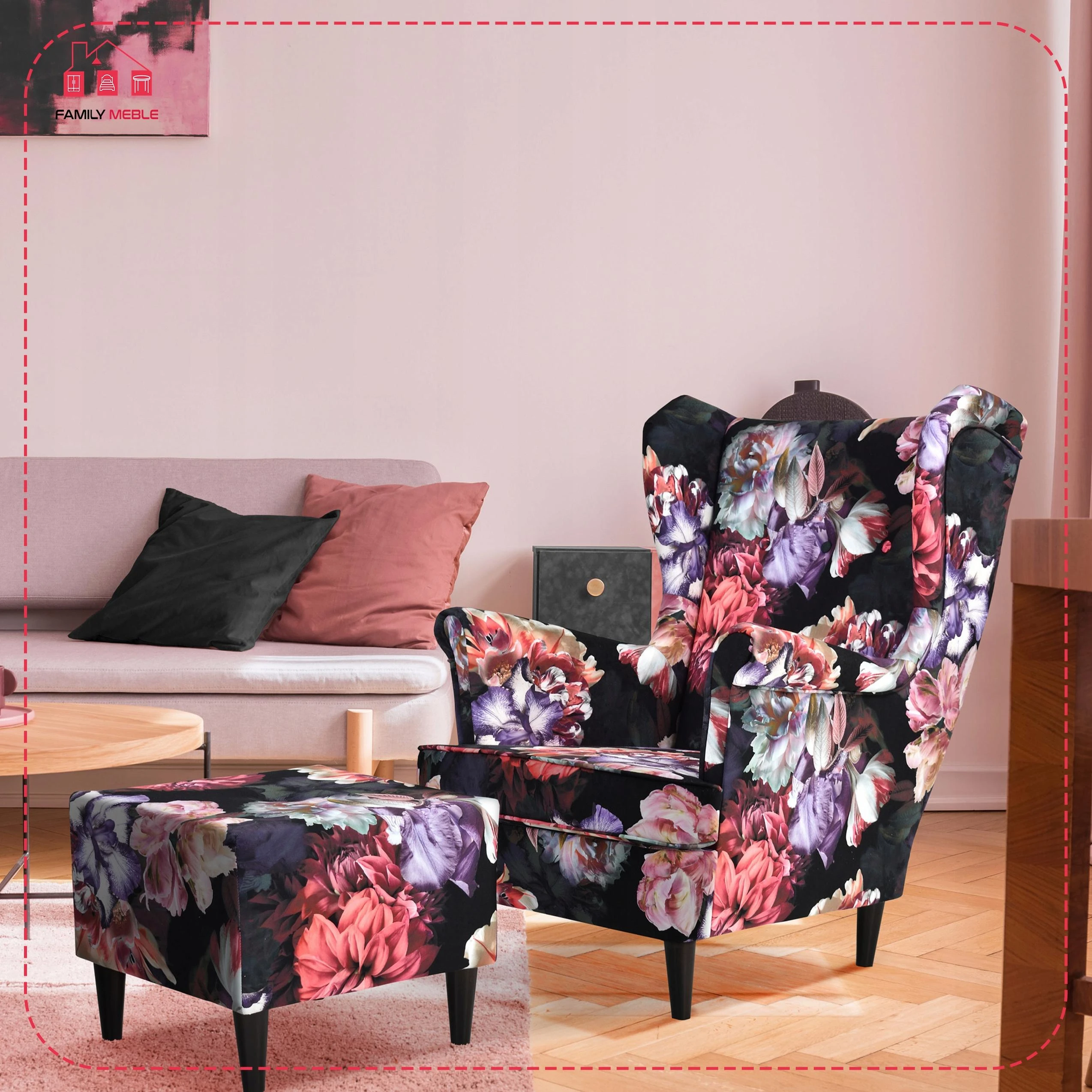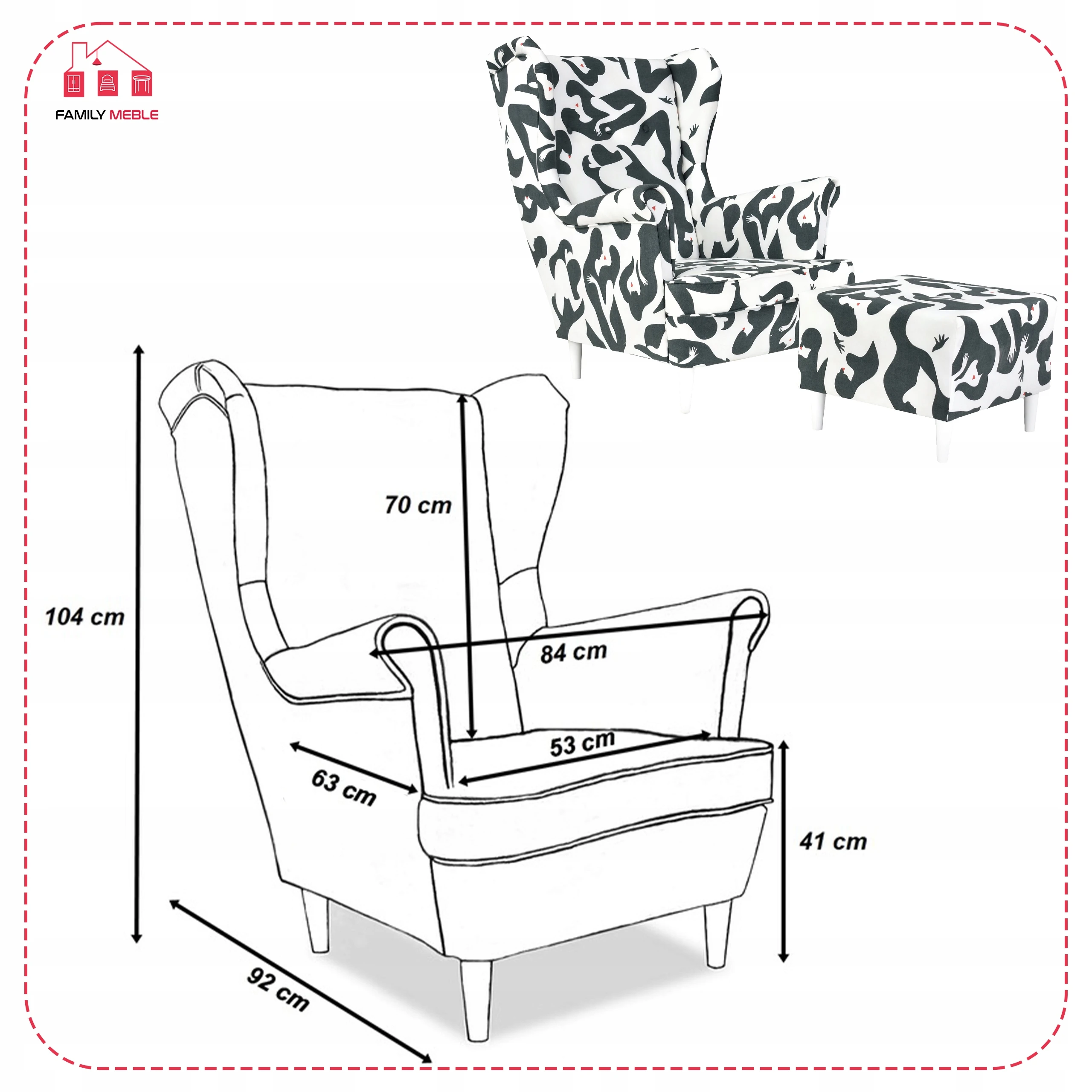 Fotel uszak ARI PRINT z podnóżkiem, skandynawski Family Meble mozaika