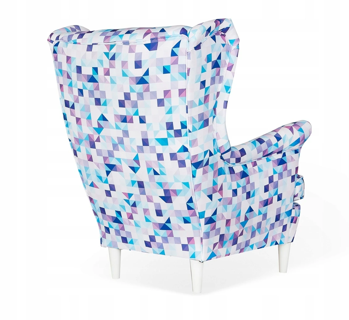 Fotel, którego dotyczy aukcja, wykonany został w tkaninie M 51. Kolorowe figury geometryczne w chłodnych barwach tj. odcienie niebieskiego, fioletu . Dzięki niejednolitej grafice ewentualne zabrudzenia są mniej widoczne.