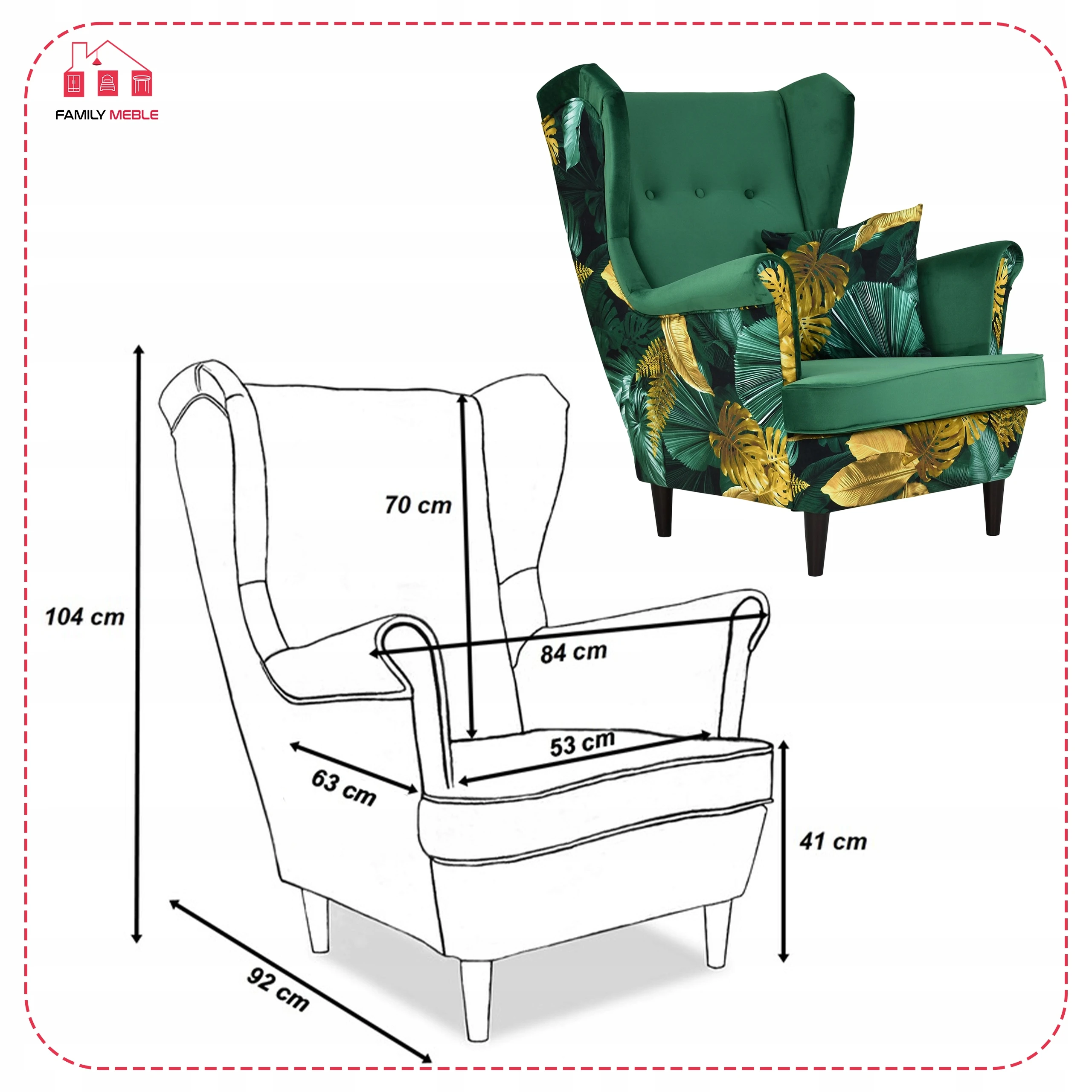 Fotel uszak skandynawski Ari Print Duo Family Meble Składając zamówienie w naszym sklepie internetowym z kodem OLX2023 otrzymasz rabat w wysokości 10% na całe zamówienie! Swoją niezwykłą nazwę fotel Uszak zawdzięcza charakterystycznym „uszom”, czyli połączonym z podłokietnikami bokom oparcia. Choć powstał setki lat temu (prawdopodobnie na dworze Ludwika XIV), wciąż jest popularny. Dzięki łagodnym liniom i klasycznemu kształtowi prezentuje się bardzo elegancko. Zastosowanie dwóch rodzajów obicia (wzorzyste i jednokolorowe) sprawia, że bez trudu dopasuje się do każdego wystroju wnętrza. Do tego jest wyjątkowo wygodny. Wybierz interesujący Cię materiał spośród kilkudziesięciu modeli naszych kolekcji. Każda tkanina i oraz kolor nóżek z oferty są w tej SAMEJ CENIE. Meble wysyłamy w ciagu 5-10 dni, za pobraniem w cenie 119 zł - zapłać za towar przy odbiorze. Oferujemy sprzedaż na RATY w atrakcyjnym finansowaniu - zapytaj sprzedawce. Specyfikacja: - Fotel Uszak z kolekcji Ari Print Duo - Typ: mebel wolnostojący (tył obity tkaniną) - Stelaż: wzmocniony listwami bukowymi i sklejką - Pianka: T-30 - Siedzisko: na sprężynie falistej - Oparcie: profilowane (zdobienie trzema guzikami materiałowymi) - Kolor nóżek: do wyboru* - Kolor obicia: do wyboru* - Zdobienie żyłką: boczki, siedzisko oraz tył - Poduszka/siedzisko posiada zamek błyskawiczny, który umożliwia wypranie pokrowca - GRATIS! poduszka o wymiarach 45 cm x 45 cm Wymiary: - wysokość całkowita: 104 cm - głębokość całkowita: 92 cm - szerokość całkowita: 84 cm - głębokość siedziska: 63 cm - szerokość siedziska: 53 cm - wysokość siedziska: 41 cm - długość podłokietnika: 50 cm - wysokość nóżek: 13 cm *Podaj wybrane kolory w Wiadomości do sprzedającego. Zapraszamy do zapoznania się z ofertą na naszej stronie internetowej: family-meble.pl Składając zamówienie w naszym sklepie internetowym z kodem OLX2023 otrzymasz rabat w wysokości 10% na całe zamówienie Sprzedaż tylko wysyłkowa, możliwy odbiór osobisty 63-600 Kępno Tkaniny Zamieszczone zdjęcia mają charakter poglądowy – w rzeczywistości kolorystyka obić może się nieco różnić. Jest to zależne od indywidualnych ustawień monitora i/lub ekranu urządzenia mobilnego, na którym są wyświetlane.