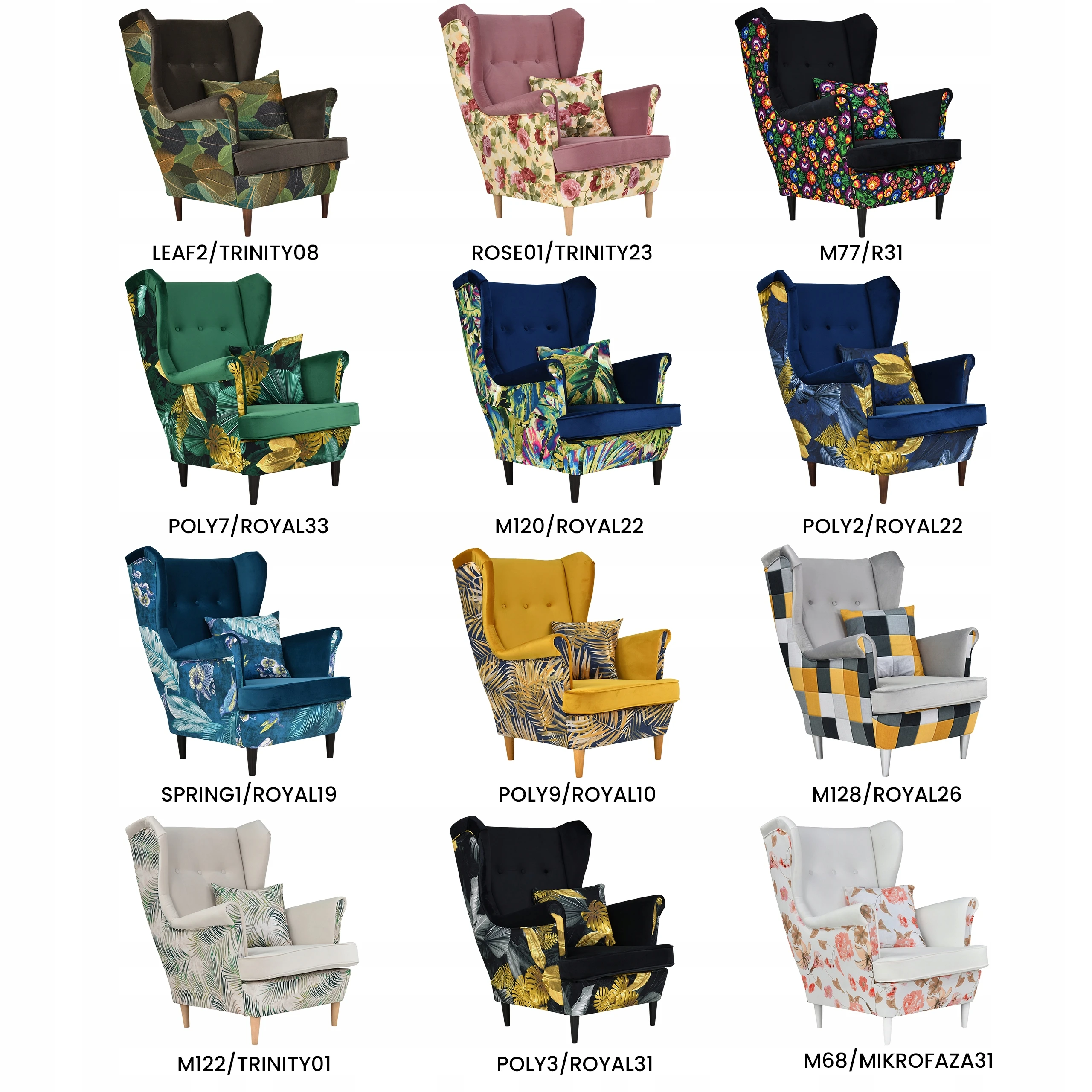 Wzory drukowane są na tkaninach welurowych i plecionkach. W skład kolekcji wchodzą wielobarwne motywy kwiatów. Fotel obity w tak efektowny wzór z pewnością ożywi każde wnętrze.