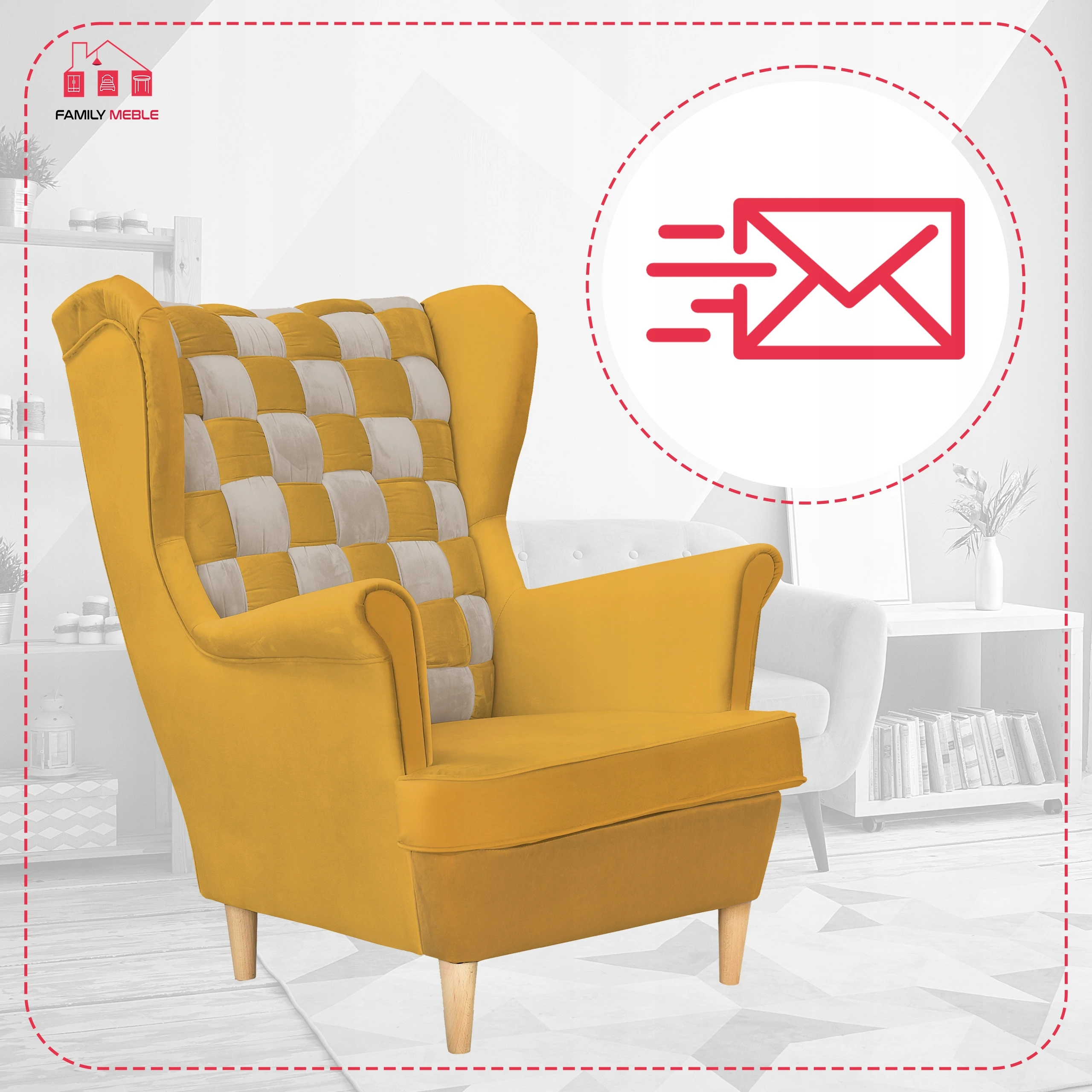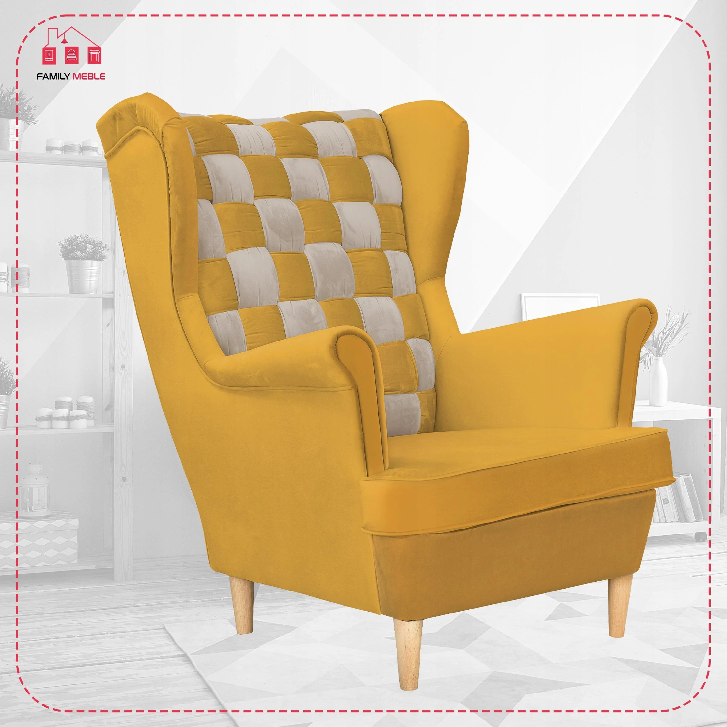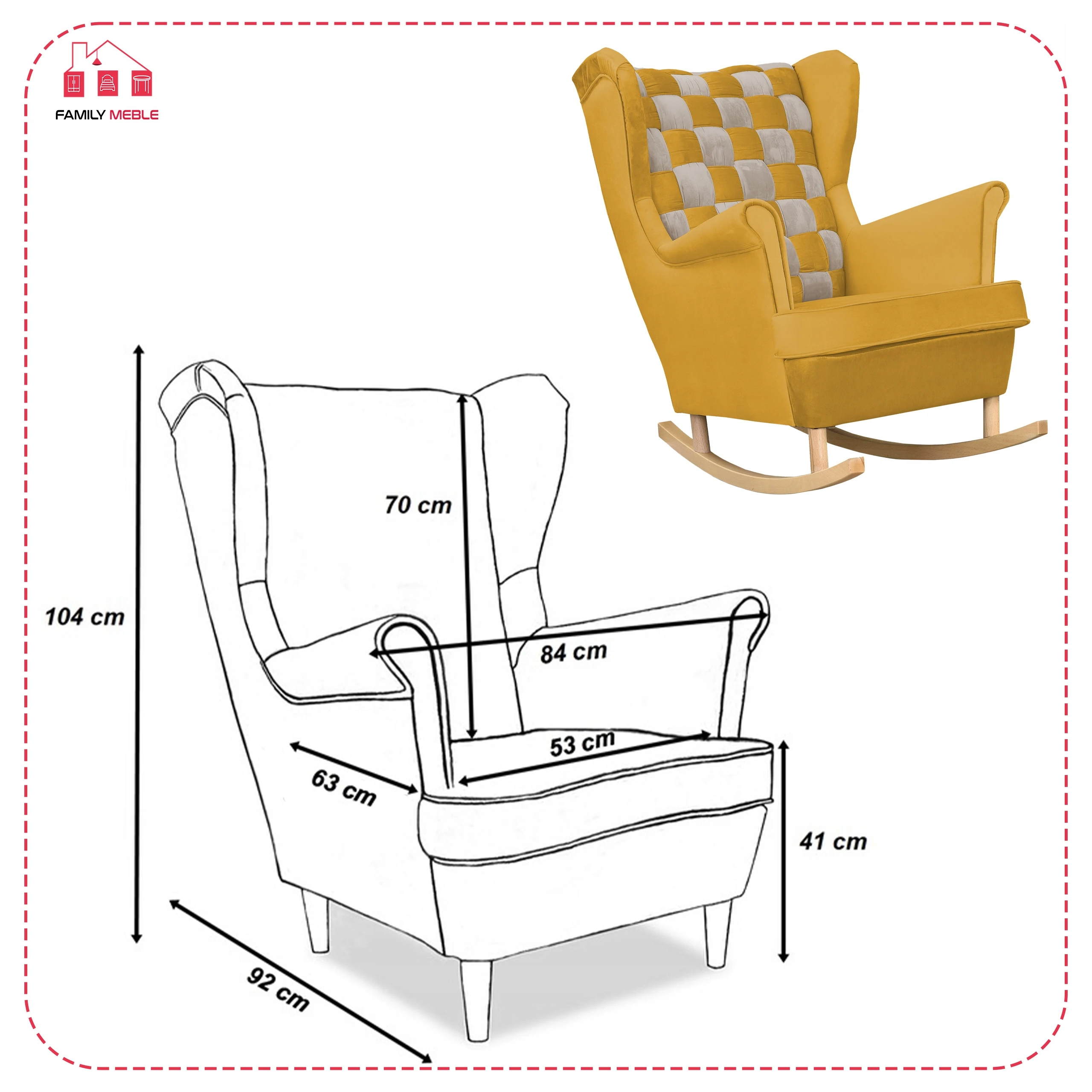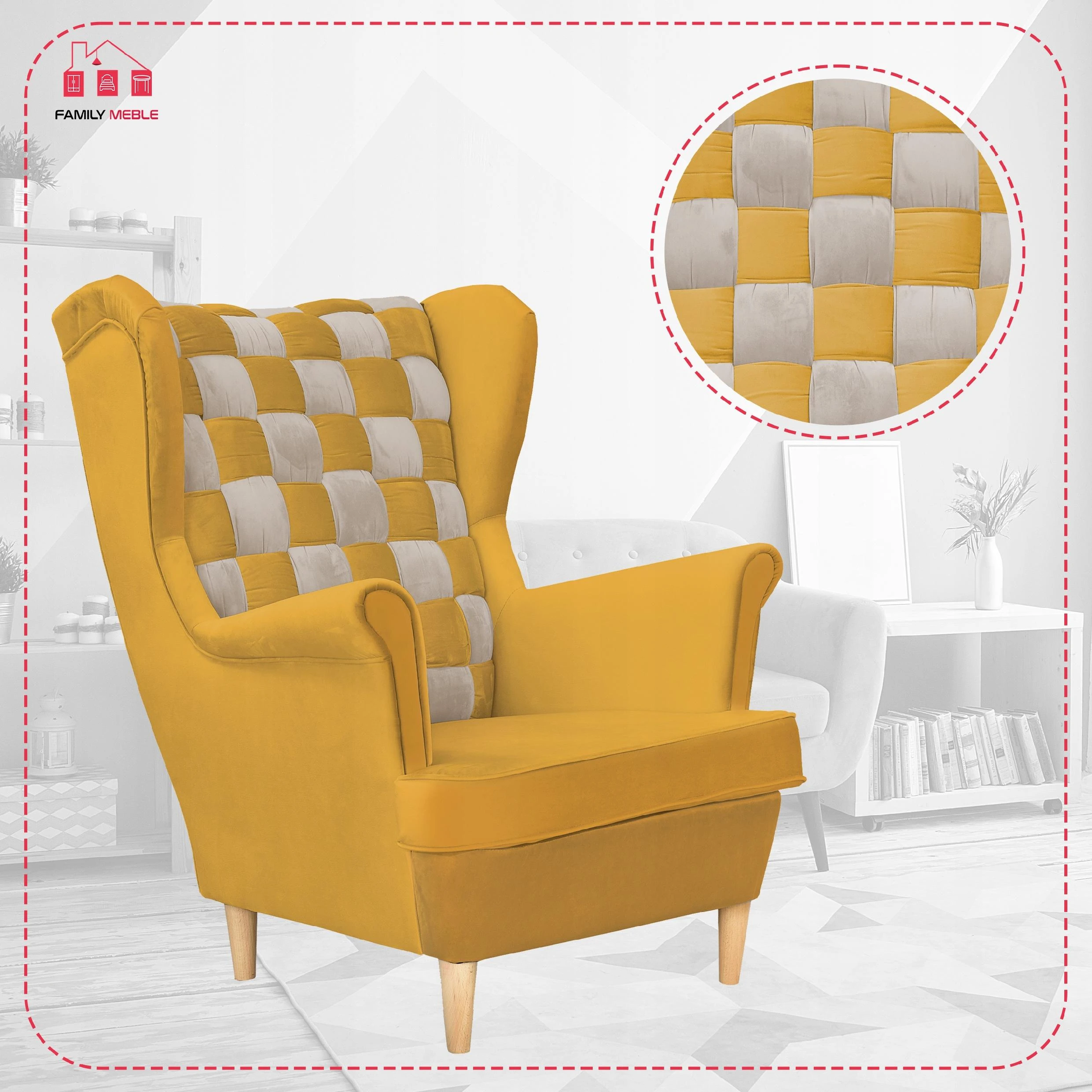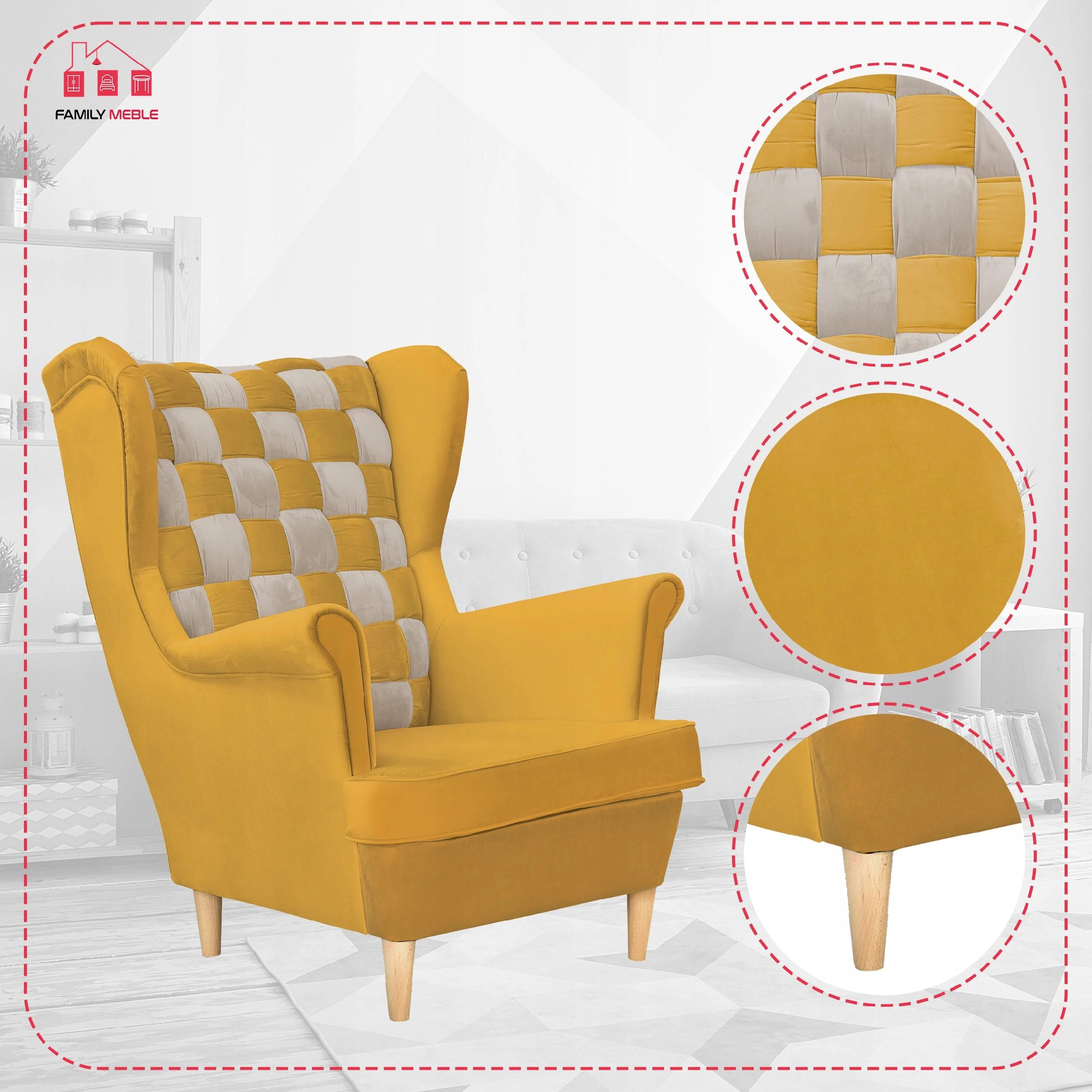 Fotel uszak skandynawski Carol Duo Family Meble Składając zamówienie w naszym sklepie internetowym z kodem OLX2023 otrzymasz rabat w wysokości 10% na całe zamówienie! Swoją niezwykłą nazwę fotel Uszak zawdzięcza charakterystycznym „uszom”, czyli połączonym z podłokietnikami bokom oparcia. Choć powstał setki lat temu (prawdopodobnie na dworze Ludwika XIV), wciąż jest popularny. Dzięki łagodnym liniom i klasycznemu kształtowi prezentuje się bardzo elegancko. Zastosowanie dwóch rodzajów obicia (wzorzyste i jednokolorowe) sprawia, że bez trudu dopasuje się do każdego wystroju wnętrza. Do tego jest wyjątkowo wygodny. Wybierz interesujący Cię materiał spośród kilkudziesięciu modeli naszych kolekcji. Każda tkanina i oraz kolor nóżek z oferty są w tej SAMEJ CENIE. Meble wysyłamy w ciagu 5-10 dni, za pobraniem w cenie 119 zł - zapłać za towar przy odbiorze. Oferujemy sprzedaż na RATY w atrakcyjnym finansowaniu - zapytaj sprzedawce. Specyfikacja: - Fotel Uszak z kolekcji Carol Duo - Typ: mebel wolnostojący (tył obity tkaniną) - Stelaż: wzmocniony listwami bukowymi i sklejką - Pianka: T-30 - Siedzisko: na sprężynie falistej - Oparcie: profilowane (zdobienie trzema guzikami materiałowymi) - Kolor nóżek: do wyboru* - Kolor obicia: do wyboru* - Zdobienie żyłką: boczki, siedzisko oraz tył - Poduszka/siedzisko posiada zamek błyskawiczny, który umożliwia wypranie pokrowca - GRATIS! poduszka o wymiarach 45 cm x 45 cm Wymiary: - wysokość całkowita: 104 cm - głębokość całkowita: 92 cm - szerokość całkowita: 84 cm - głębokość siedziska: 63 cm - szerokość siedziska: 53 cm - wysokość siedziska: 41 cm - długość podłokietnika: 50 cm - wysokość nóżek: 13 cm *Podaj wybrane kolory w Wiadomości do sprzedającego. Zapraszamy do zapoznania się z ofertą na naszej stronie internetowej: family-meble.pl Składając zamówienie w naszym sklepie internetowym z kodem OLX2023 otrzymasz rabat w wysokości 10% na całe zamówienie Sprzedaż tylko wysyłkowa, możliwy odbiór osobisty 63-600 Kępno Tkaniny Zamieszczone zdjęcia mają charakter poglądowy – w rzeczywistości kolorystyka obić może się nieco różnić. Jest to zależne od indywidualnych ustawień monitora i/lub ekranu urządzenia mobilnego, na którym są wyświetlane.