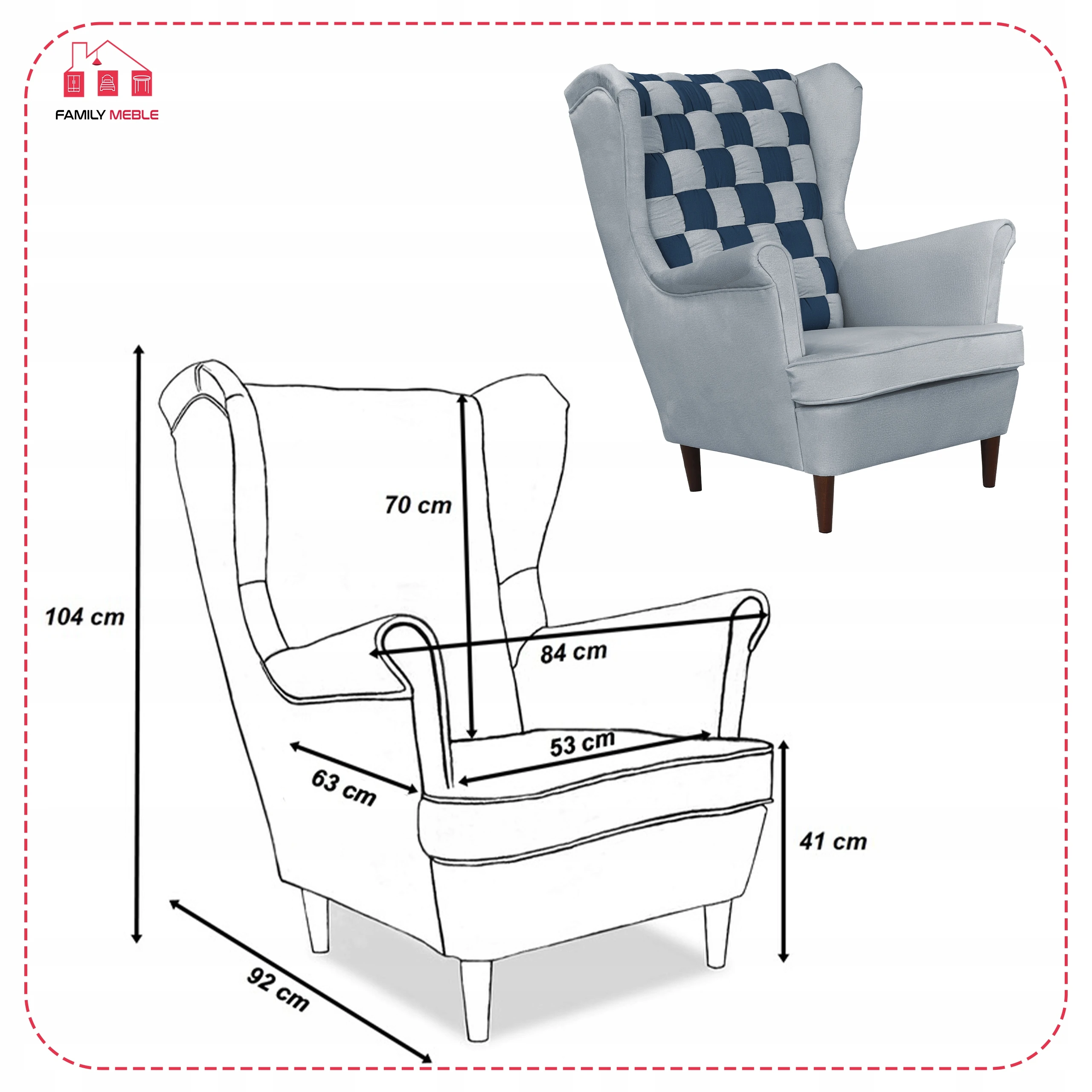 Fotel uszak skandynawski Carol Duo Family Meble Składając zamówienie w naszym sklepie internetowym z kodem OLX2023 otrzymasz rabat w wysokości 10% na całe zamówienie! Swoją niezwykłą nazwę fotel Uszak zawdzięcza charakterystycznym „uszom”, czyli połączonym z podłokietnikami bokom oparcia. Choć powstał setki lat temu (prawdopodobnie na dworze Ludwika XIV), wciąż jest popularny. Dzięki łagodnym liniom i klasycznemu kształtowi prezentuje się bardzo elegancko. Zastosowanie dwóch rodzajów obicia (wzorzyste i jednokolorowe) sprawia, że bez trudu dopasuje się do każdego wystroju wnętrza. Do tego jest wyjątkowo wygodny. Wybierz interesujący Cię materiał spośród kilkudziesięciu modeli naszych kolekcji. Każda tkanina i oraz kolor nóżek z oferty są w tej SAMEJ CENIE. Meble wysyłamy w ciagu 5-10 dni, za pobraniem w cenie 119 zł - zapłać za towar przy odbiorze. Oferujemy sprzedaż na RATY w atrakcyjnym finansowaniu - zapytaj sprzedawce. Specyfikacja: - Fotel Uszak z kolekcji Carol Duo - Typ: mebel wolnostojący (tył obity tkaniną) - Stelaż: wzmocniony listwami bukowymi i sklejką - Pianka: T-30 - Siedzisko: na sprężynie falistej - Oparcie: profilowane (zdobienie trzema guzikami materiałowymi) - Kolor nóżek: do wyboru* - Kolor obicia: do wyboru* - Zdobienie żyłką: boczki, siedzisko oraz tył - Poduszka/siedzisko posiada zamek błyskawiczny, który umożliwia wypranie pokrowca - GRATIS! poduszka o wymiarach 45 cm x 45 cm Wymiary: - wysokość całkowita: 104 cm - głębokość całkowita: 92 cm - szerokość całkowita: 84 cm - głębokość siedziska: 63 cm - szerokość siedziska: 53 cm - wysokość siedziska: 41 cm - długość podłokietnika: 50 cm - wysokość nóżek: 13 cm *Podaj wybrane kolory w Wiadomości do sprzedającego. Zapraszamy do zapoznania się z ofertą na naszej stronie internetowej: family-meble.pl Składając zamówienie w naszym sklepie internetowym z kodem OLX2023 otrzymasz rabat w wysokości 10% na całe zamówienie Sprzedaż tylko wysyłkowa, możliwy odbiór osobisty 63-600 Kępno Tkaniny Zamieszczone zdjęcia mają charakter poglądowy – w rzeczywistości kolorystyka obić może się nieco różnić. Jest to zależne od indywidualnych ustawień monitora i/lub ekranu urządzenia mobilnego, na którym są wyświetlane.
