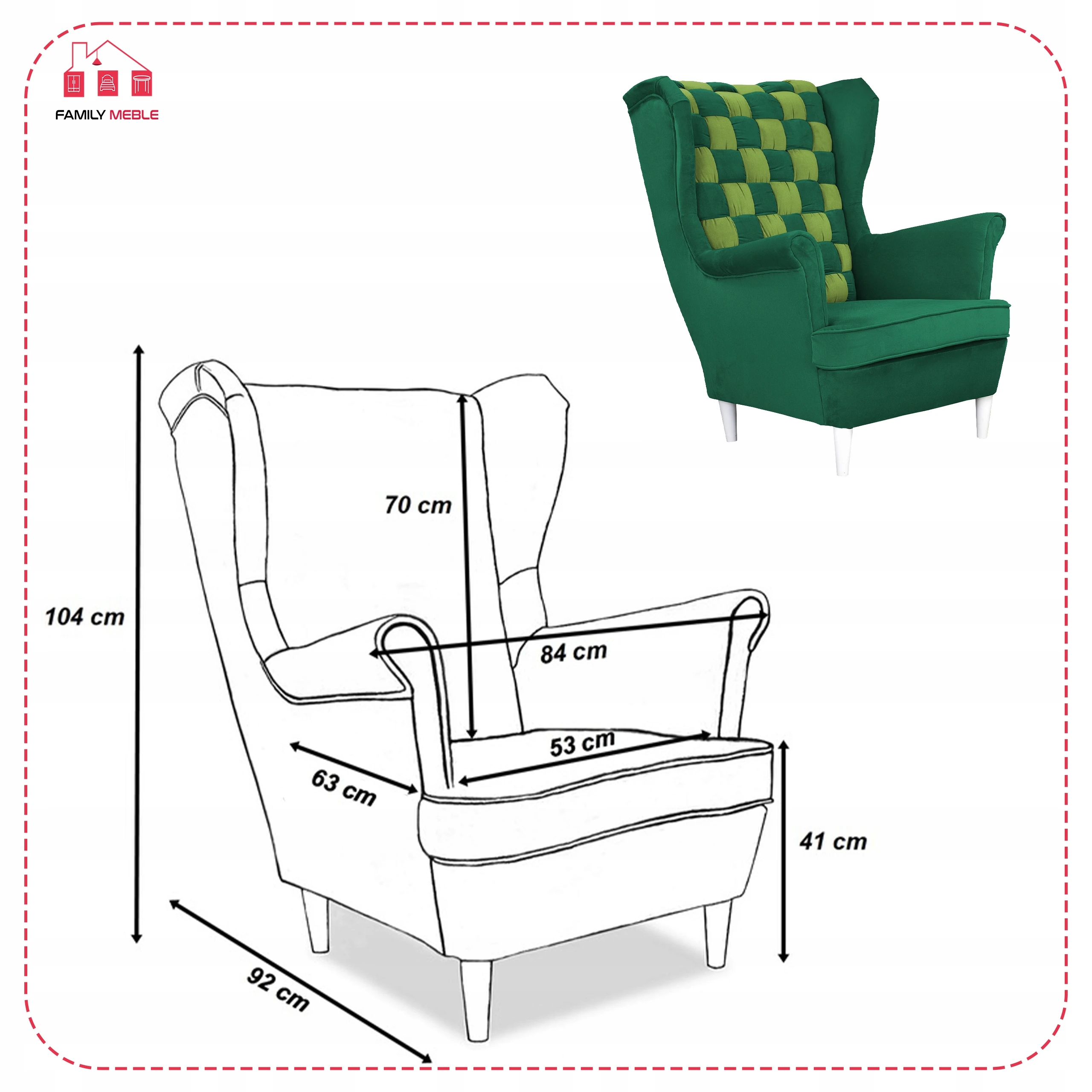 Fotel uszak skandynawski Carol Duo Family Meble Składając zamówienie w naszym sklepie internetowym z kodem OLX2023 otrzymasz rabat w wysokości 10% na całe zamówienie! Swoją niezwykłą nazwę fotel Uszak zawdzięcza charakterystycznym „uszom”, czyli połączonym z podłokietnikami bokom oparcia. Choć powstał setki lat temu (prawdopodobnie na dworze Ludwika XIV), wciąż jest popularny. Dzięki łagodnym liniom i klasycznemu kształtowi prezentuje się bardzo elegancko. Zastosowanie dwóch rodzajów obicia (wzorzyste i jednokolorowe) sprawia, że bez trudu dopasuje się do każdego wystroju wnętrza. Do tego jest wyjątkowo wygodny. Wybierz interesujący Cię materiał spośród kilkudziesięciu modeli naszych kolekcji. Każda tkanina i oraz kolor nóżek z oferty są w tej SAMEJ CENIE. Meble wysyłamy w ciagu 5-10 dni, za pobraniem w cenie 119 zł - zapłać za towar przy odbiorze. Oferujemy sprzedaż na RATY w atrakcyjnym finansowaniu - zapytaj sprzedawce. Specyfikacja: - Fotel Uszak z kolekcji Carol Duo - Typ: mebel wolnostojący (tył obity tkaniną) - Stelaż: wzmocniony listwami bukowymi i sklejką - Pianka: T-30 - Siedzisko: na sprężynie falistej - Oparcie: profilowane (zdobienie trzema guzikami materiałowymi) - Kolor nóżek: do wyboru* - Kolor obicia: do wyboru* - Zdobienie żyłką: boczki, siedzisko oraz tył - Poduszka/siedzisko posiada zamek błyskawiczny, który umożliwia wypranie pokrowca - GRATIS! poduszka o wymiarach 45 cm x 45 cm Wymiary: - wysokość całkowita: 104 cm - głębokość całkowita: 92 cm - szerokość całkowita: 84 cm - głębokość siedziska: 63 cm - szerokość siedziska: 53 cm - wysokość siedziska: 41 cm - długość podłokietnika: 50 cm - wysokość nóżek: 13 cm *Podaj wybrane kolory w Wiadomości do sprzedającego. Zapraszamy do zapoznania się z ofertą na naszej stronie internetowej: family-meble.pl Składając zamówienie w naszym sklepie internetowym z kodem OLX2023 otrzymasz rabat w wysokości 10% na całe zamówienie Sprzedaż tylko wysyłkowa, możliwy odbiór osobisty 63-600 Kępno Tkaniny Zamieszczone zdjęcia mają charakter poglądowy – w rzeczywistości kolorystyka obić może się nieco różnić. Jest to zależne od indywidualnych ustawień monitora i/lub ekranu urządzenia mobilnego, na którym są wyświetlane.