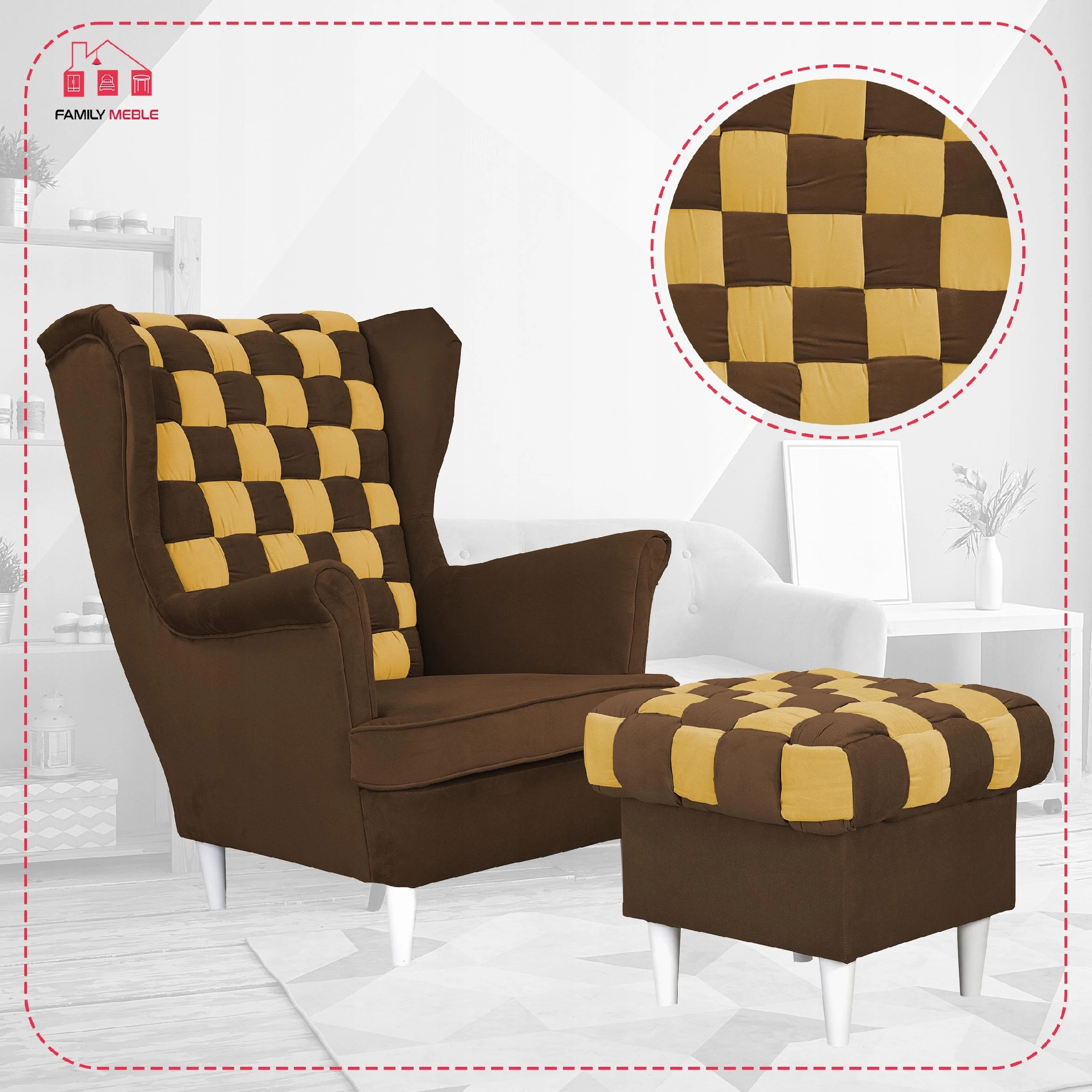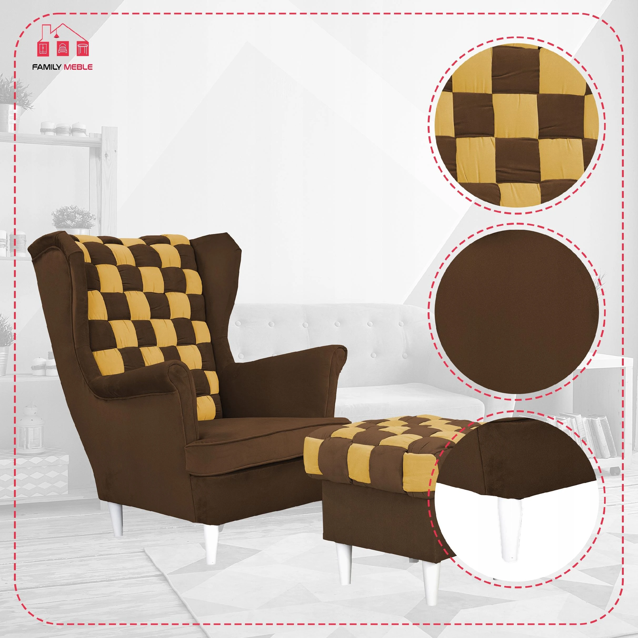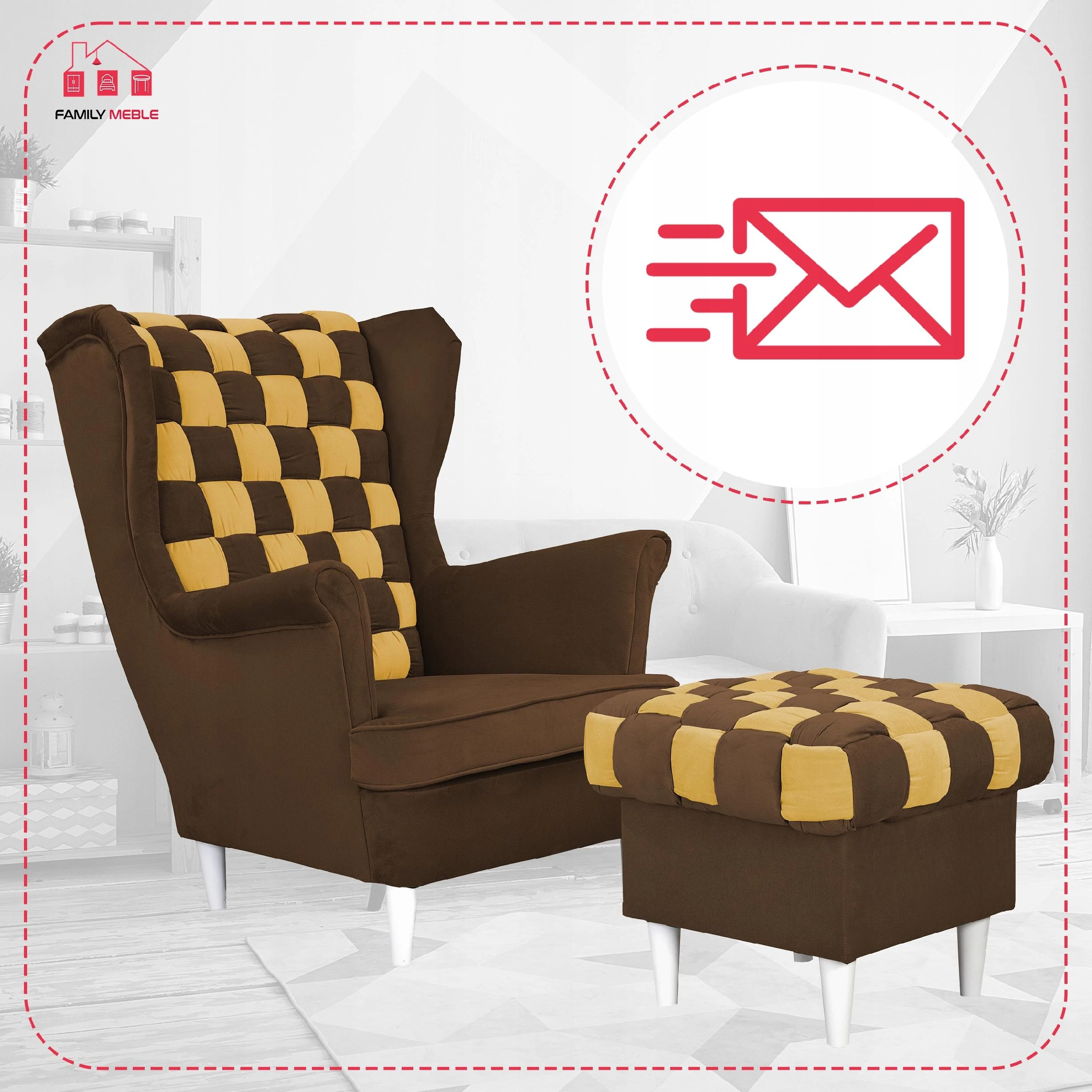 Fotel uszak Carol Duo z podnóżkiem skandynawski Family Meble brązowy żółty