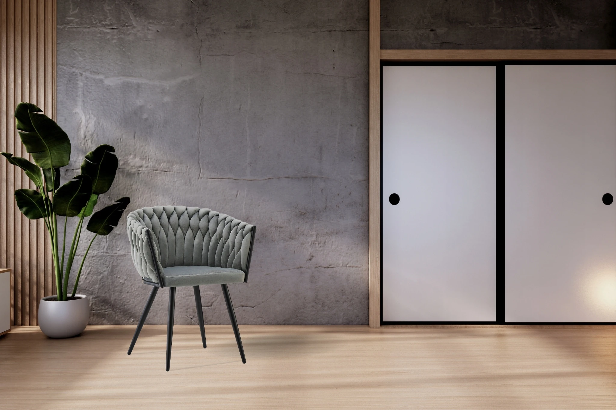 Jego wyjątkowy design, z subtelnym przeplotem na oparciu, dodaje wnętrzu wyrafinowanego charakteru.