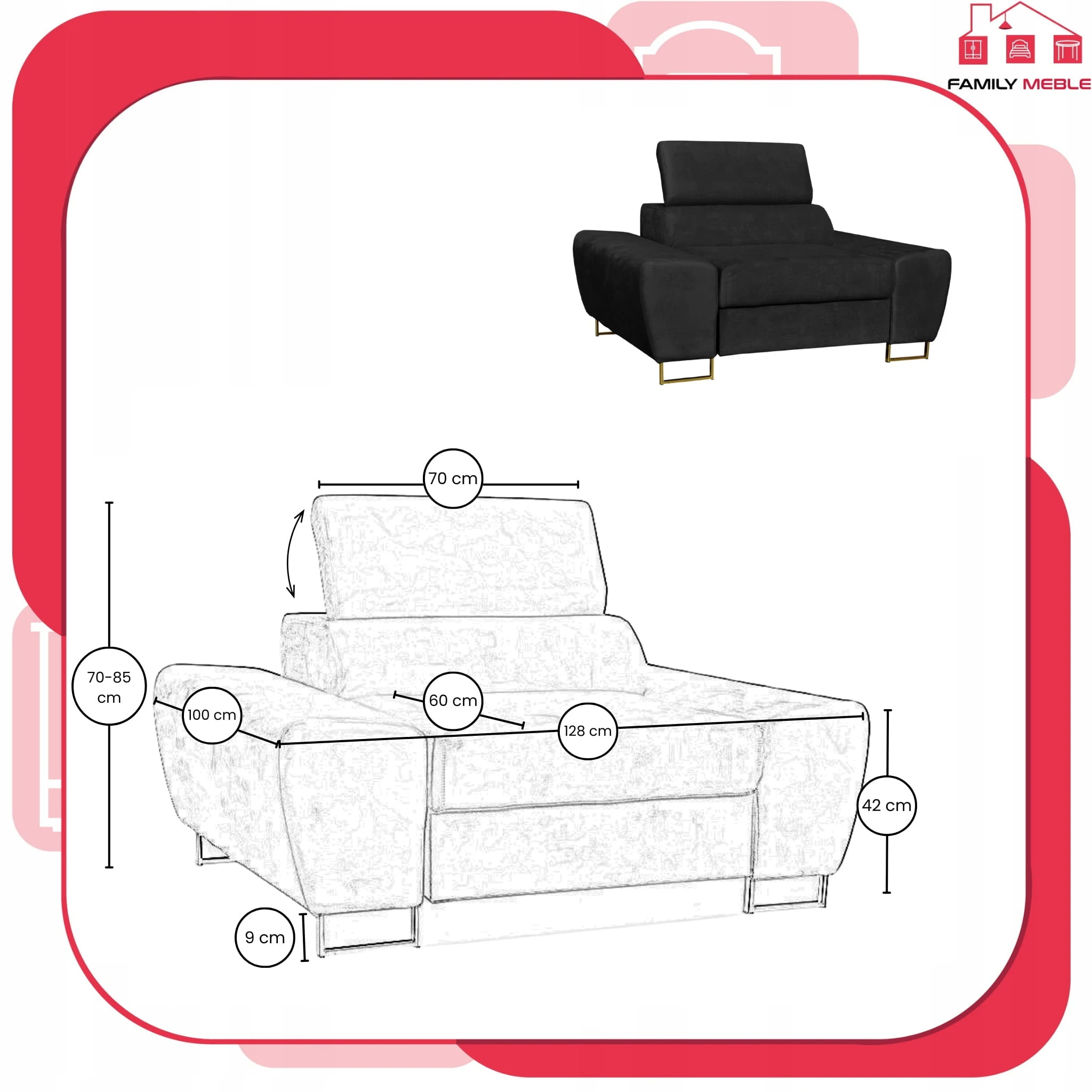 Fotel wypoczynkowy Bosso salon Family meble czarny welur reg zagłówek