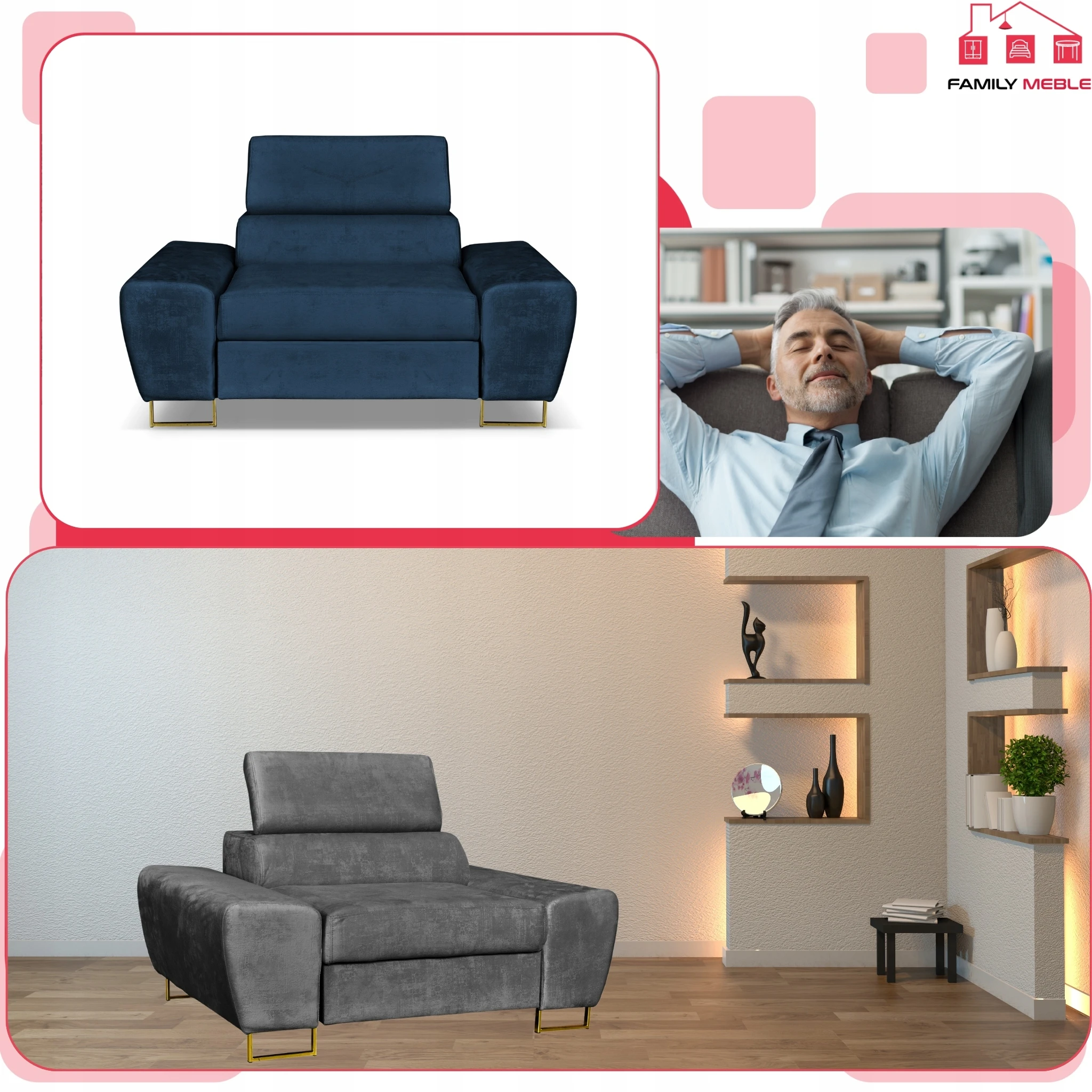 Fotel wypoczynkowy Bosso salon Family meble granat welur reg zagłówek