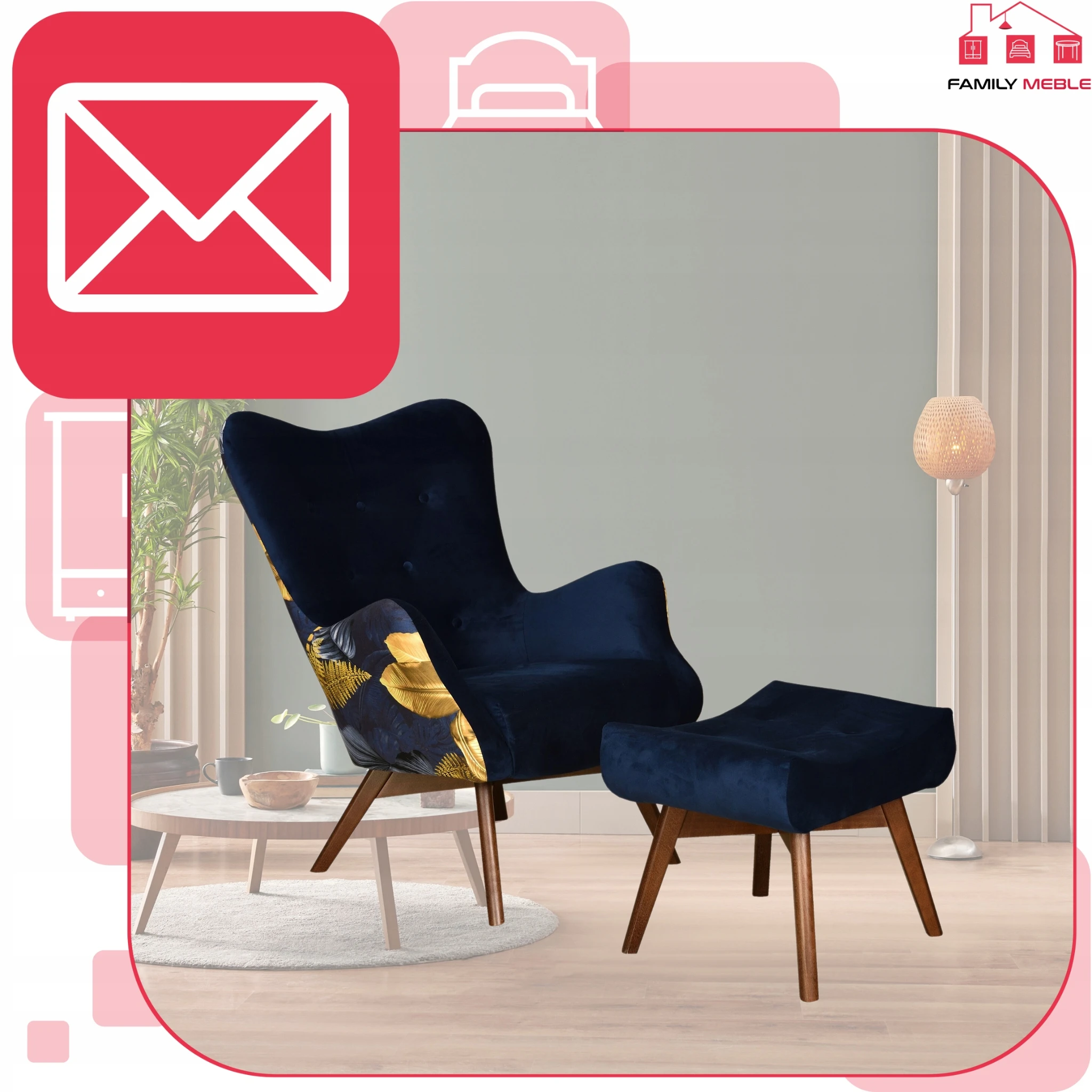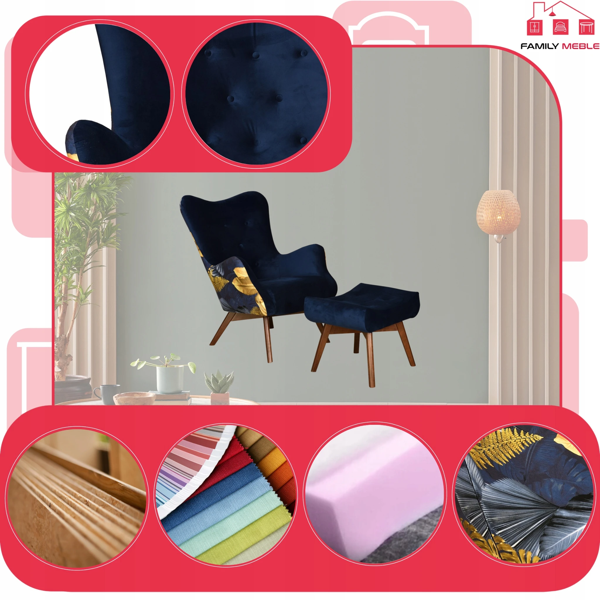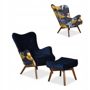 Fotel z pufą skandynawski uszak Luna Print Duo podnóżkiem Family meble kobalt