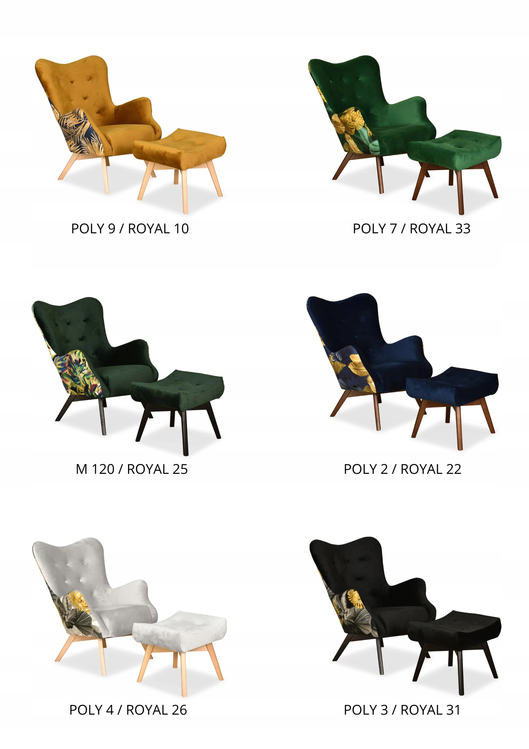 Wzory drukowane są na tkaninach welurowych i plecionkach. W skład kolekcji wchodzą wielobarwne motywy kwiatów. Fotel obity w tak efektowny wzór z pewnością ożywi każde wnętrze.