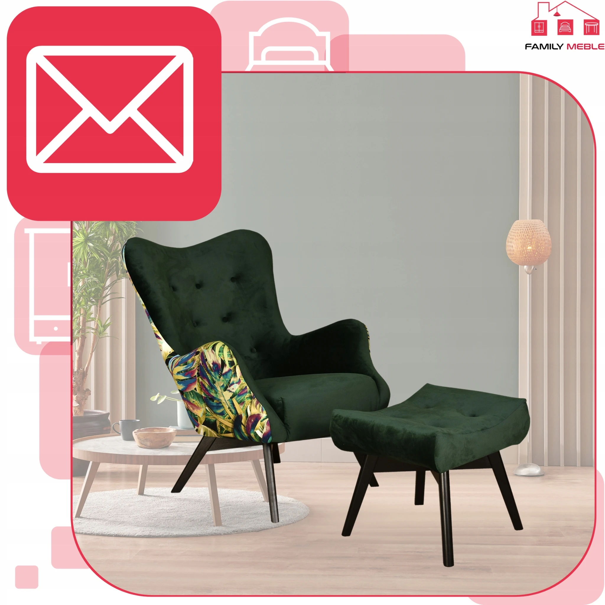 Fotel z pufą skandynawski uszak Luna Print Duo podnóżkiem Family meble zielony