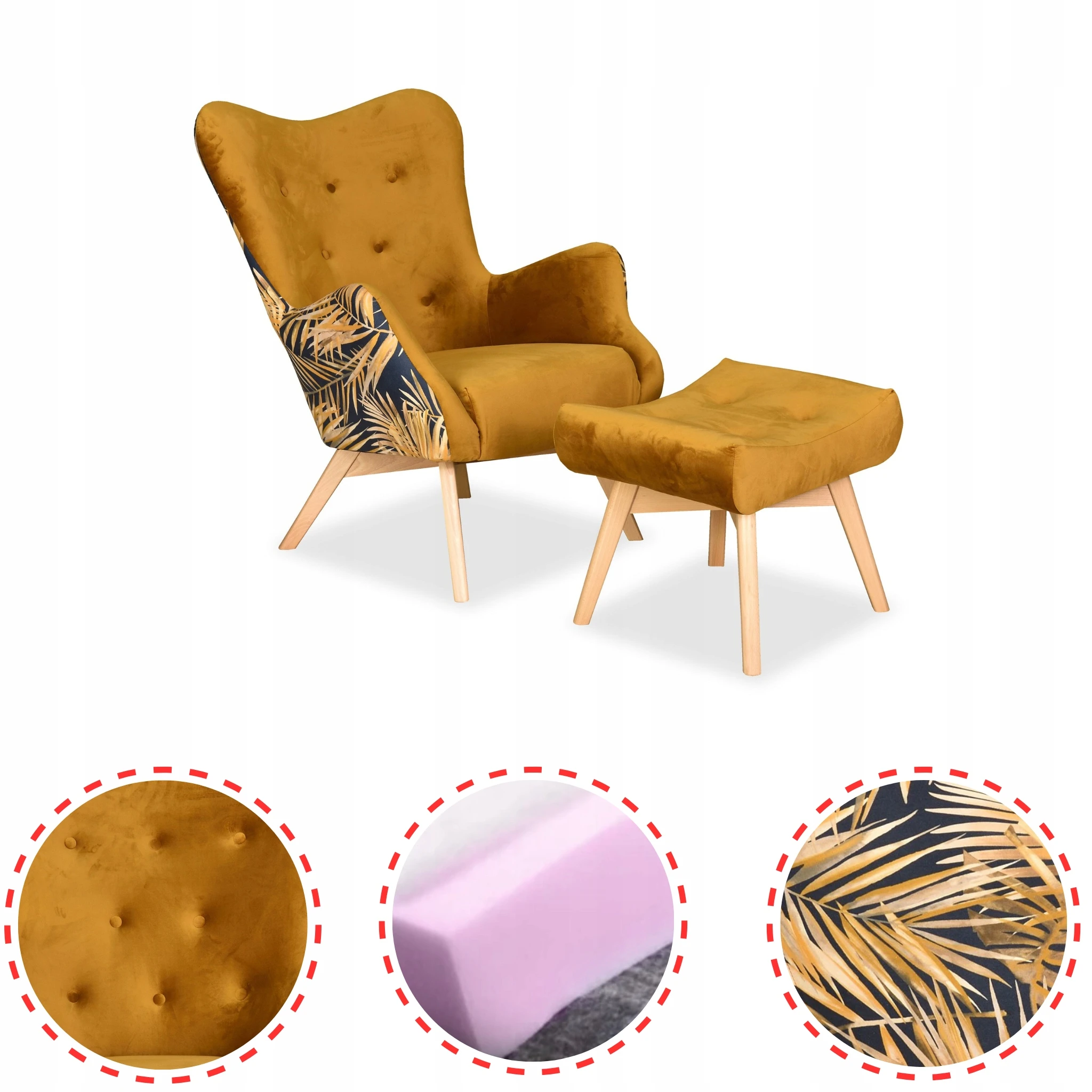 Fotel z pufą skandynawski uszak Luna Print Duo podnóżkiem Family meble złoty