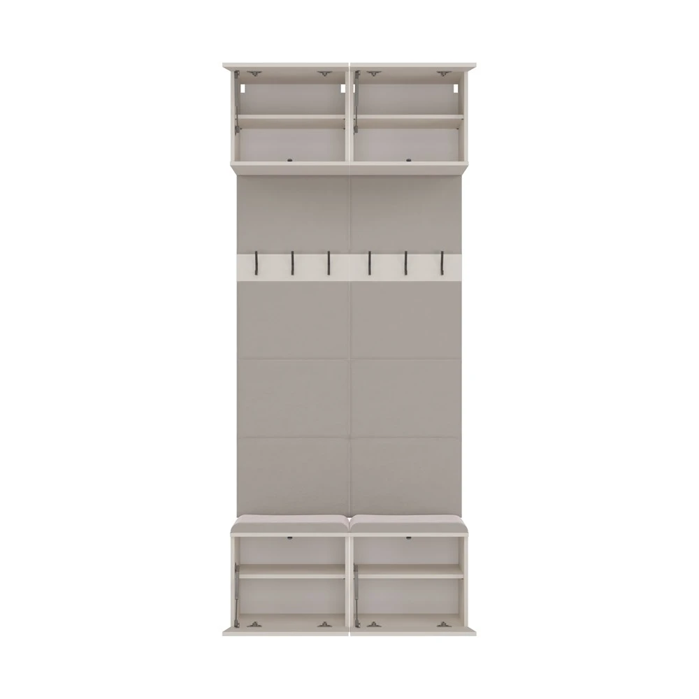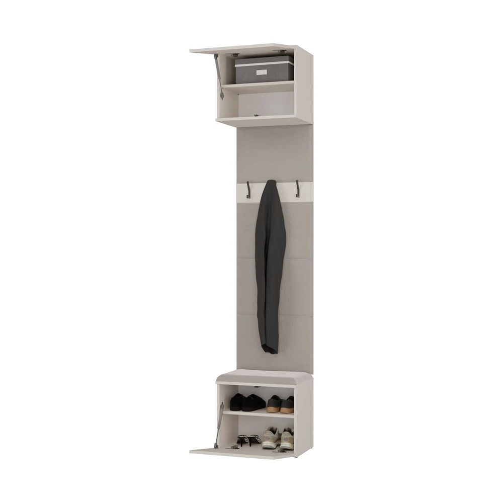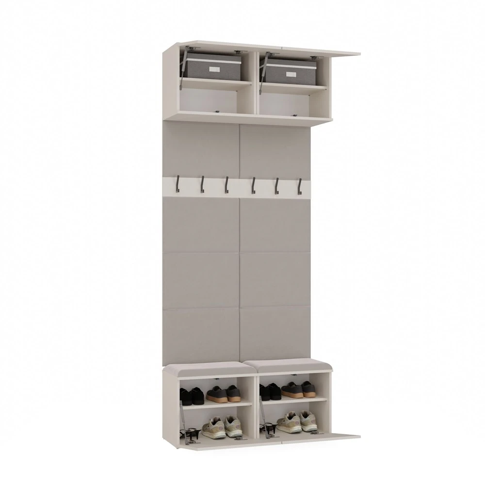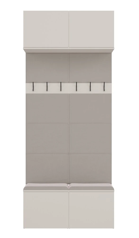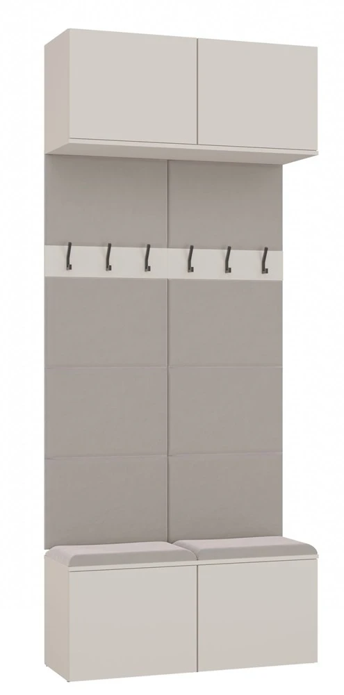 HAGA II 2W to kompaktowy i funkcjonalny mebel do przedpokoju, który łączy szafki dolne z wygodnym siedziskiem z miejscem do przechowywania, panele z wieszakami na odzież oraz praktyczne szafki górne.
