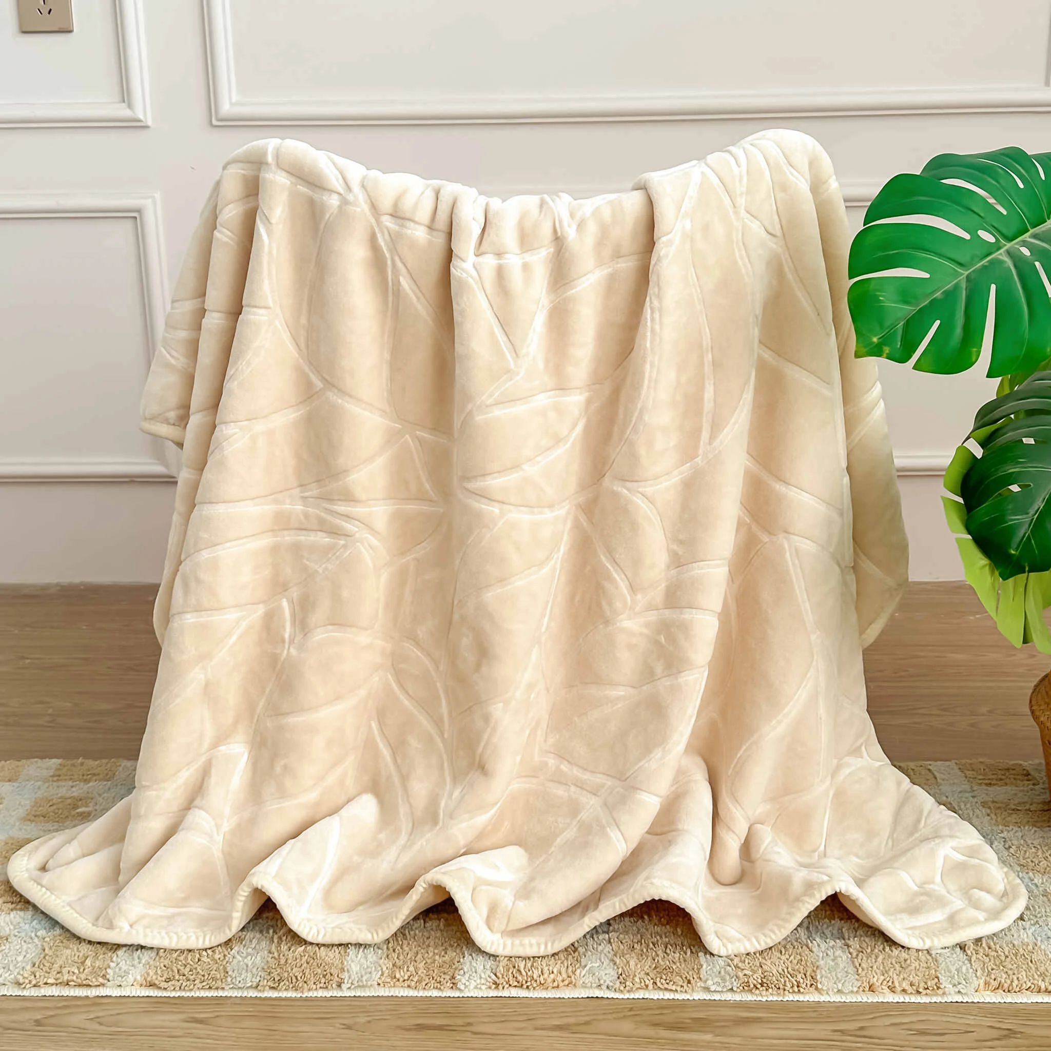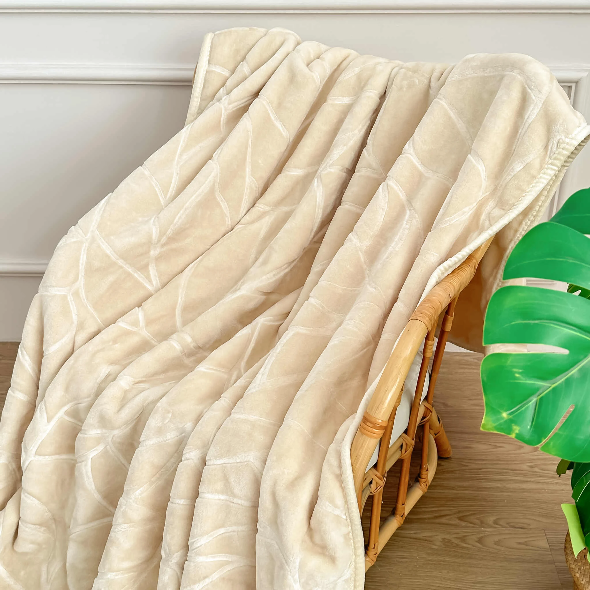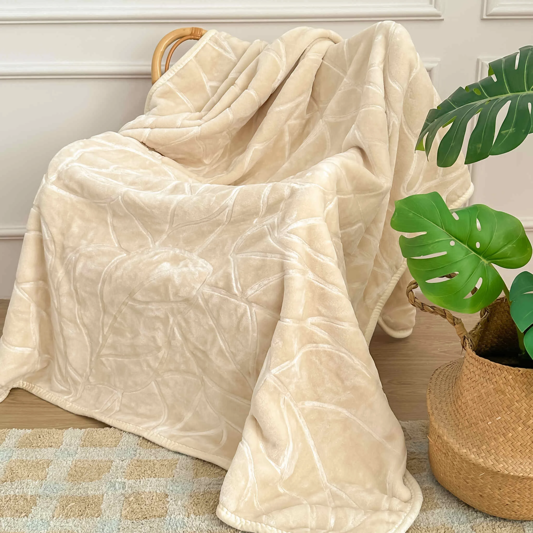 Wyróżnia się miękką, przyjemną w dotyku strukturą, która zapewnia doskonały komfort i ciepło. Jedna strona zdobiona jest subtelnym, tłoczonym wzorem w liście, podczas gdy druga pozostaje gładka i matowa, co dodaje mu klasycznego uroku. Brzegi koca zostały starannie wykończone taśmą, co chroni materiał przed uszkodzeniem i zapewnia długotrwałe użytkowanie.