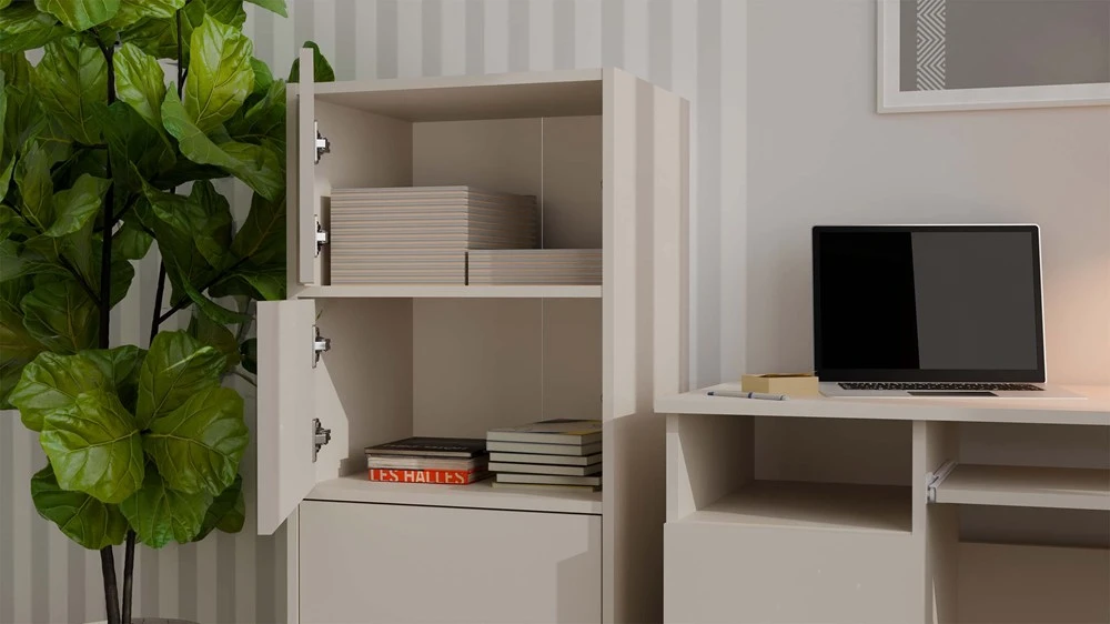 Dzięki pojemnym półkom ukrytym za gładkimi drzwiami, komoda zapewnia mnóstwo miejsca do przechowywania i ułatwia utrzymanie porządku w każdej przestrzeni.