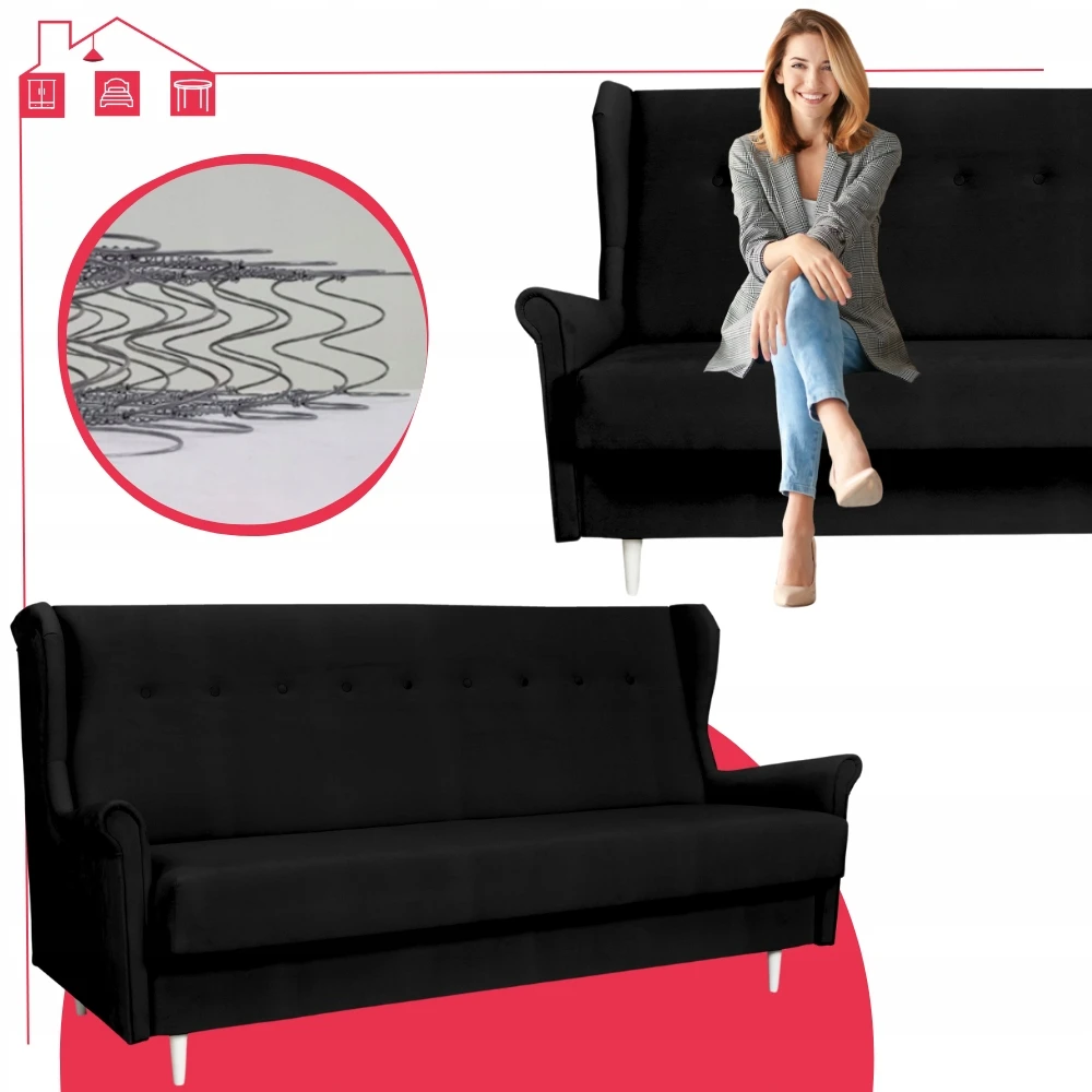 - Dodatkowe funkcje wersalki: funkcja spania, podłokietniki, pojemnik na pościel