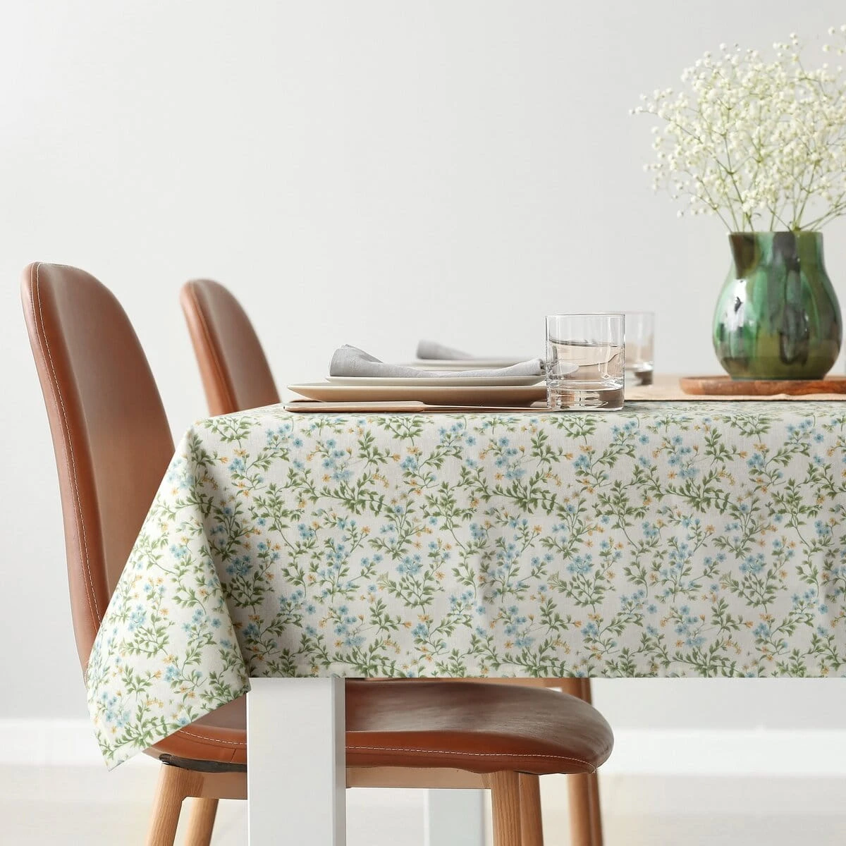 Plamoodporny obrus dekoracyjny TARA z delikatnym nadrukiem botanicznym wnosi do wnętrza świeżość, lekkość i subtelną, naturalną elegancję. Kwiatowy motyw w niezapominajek pięknie ożywia aranżację stołu, nadając jej romantyczny i wiosenny charakter.
