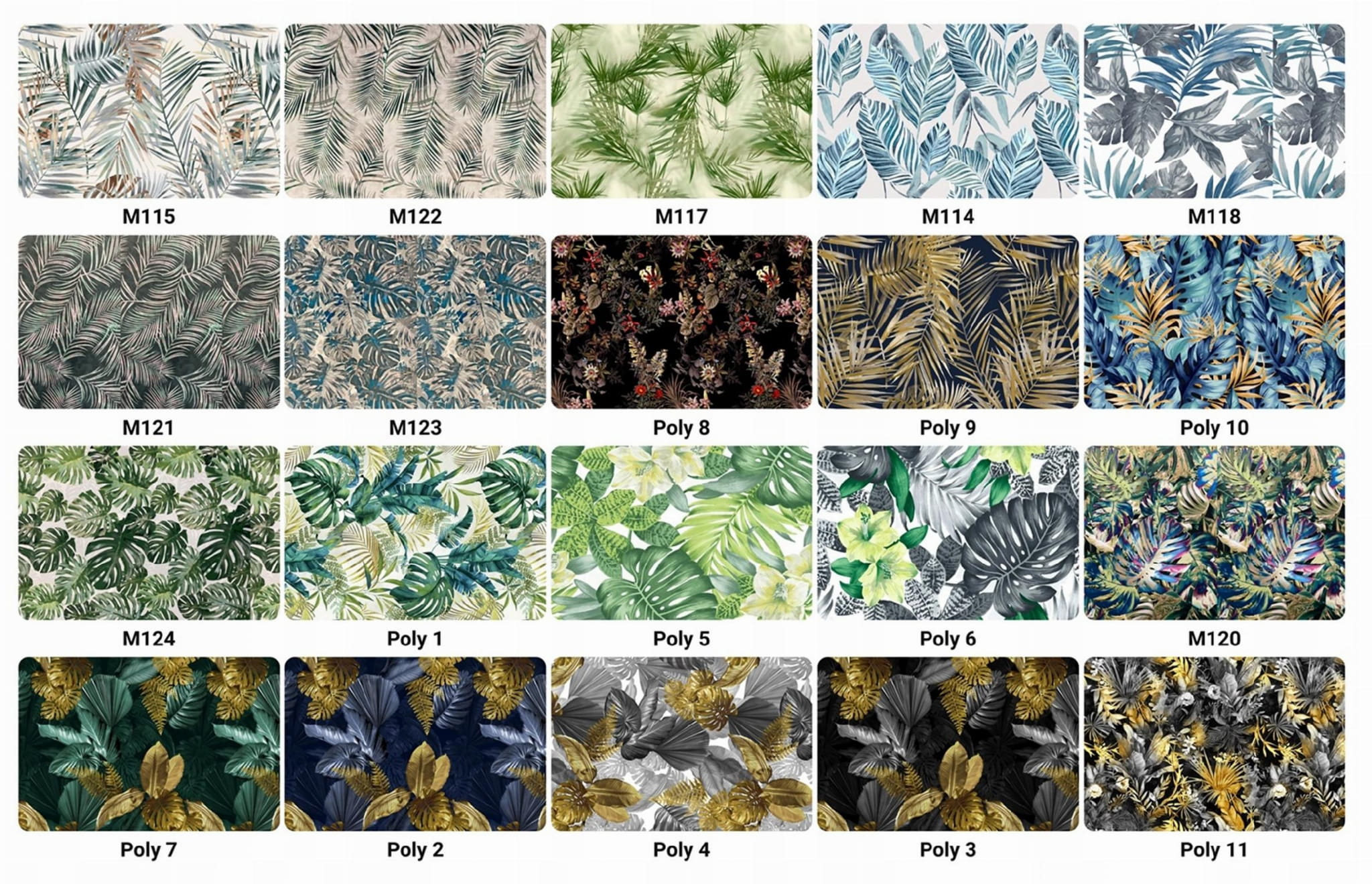 Wzory drukowane są na tkaninach welurowych i plecionkach. W skład kolekcji wchodzą wielobarwne motywy kwiatów. Fotel obity w tak efektowny wzór z pewnością ożywi każde wnętrze.