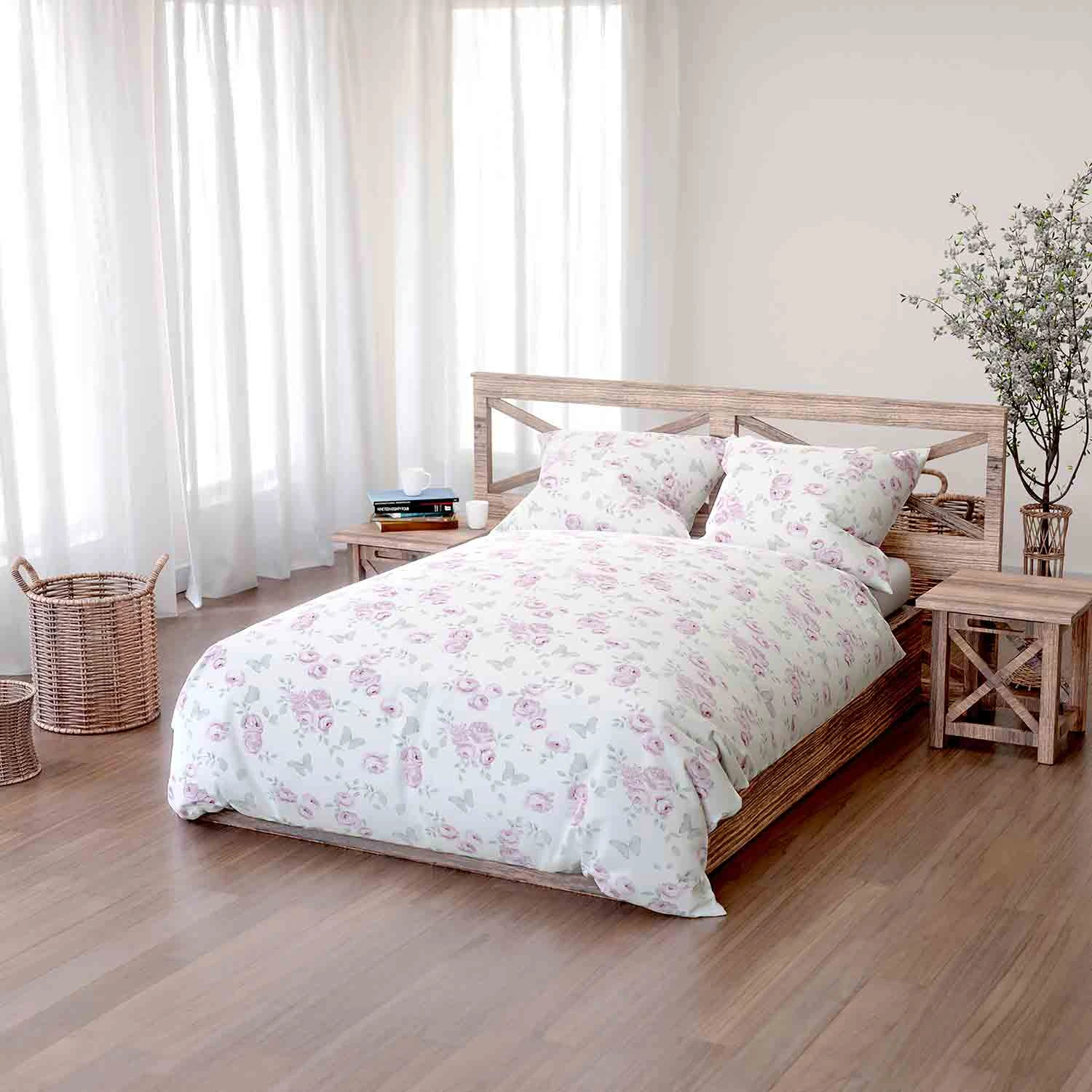 Pościel bawełniana CALMIA 200x220 biała pudrowa motyw kwiatowy