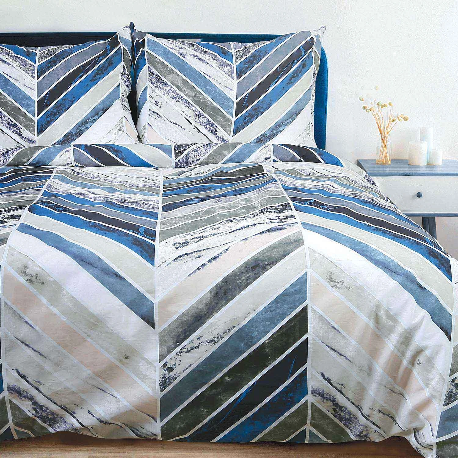 Pościel bawełniana COTTONLOVE 220x200 niebieska geometryczny wzór jodełki