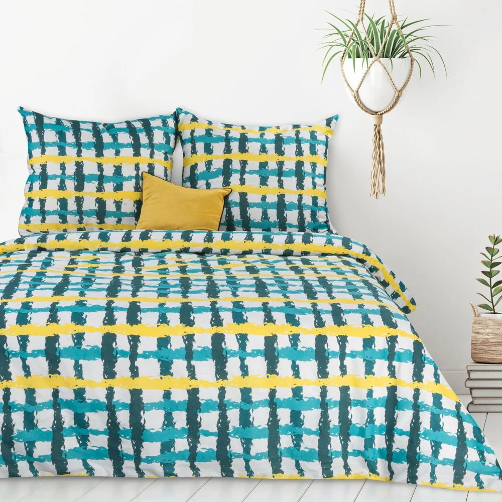 Pościel bawełniana IDA 200x220 Design91 zielona żółta kratka na białym tle