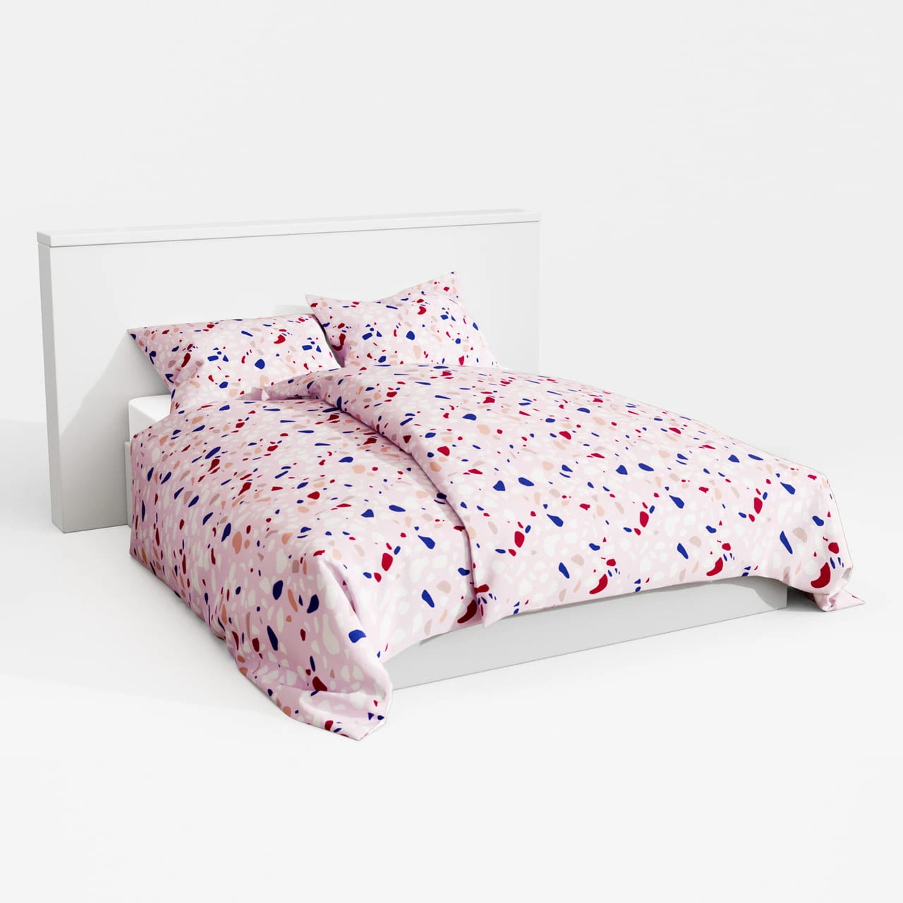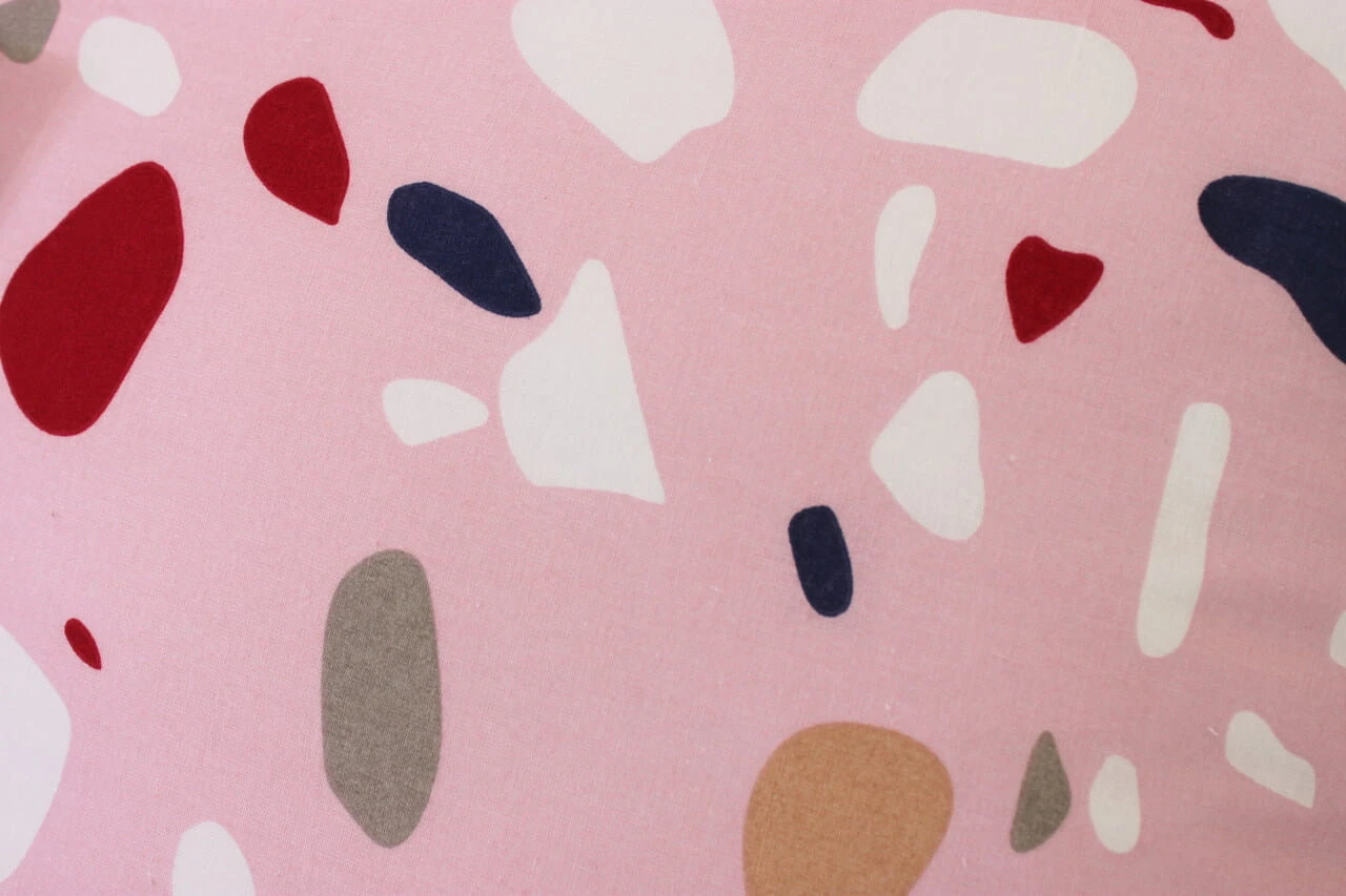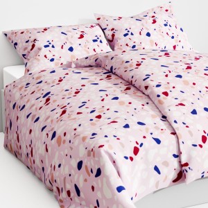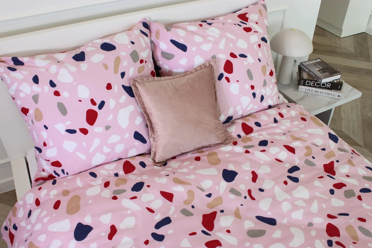Pościel wyróżnia się wielokolorowym wzorem, który nawiązuje do popularnych płytek lastrykowych w eleganckim zestawieniu z różowym tłem. Tkanina została wykonana w 100% z bawełny, co zapewnia komfort użytkowania i naturalny charakter produktu.