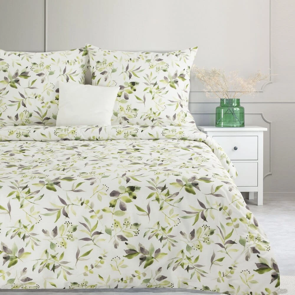 Pościel bawełniana MILI 220x200 Eurofirany biała zielona wzór roślinny gałązki