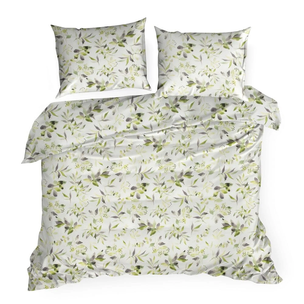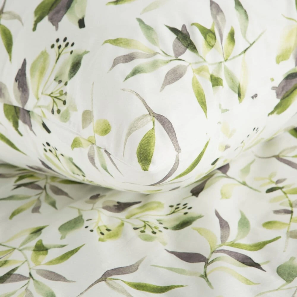 Stylowa pościel bawełniana MILI z subtelnym wzorem roślinnym w odcieniach zieleni i szarości. Delikatne gałązki i listki na jasnym tle tworzą elegancki, naturalny design, który wprowadzi do sypialni świeżość i harmonię. Wykonana z wysokiej jakości bawełny, zapewnia komfortowy i przyjemny sen.