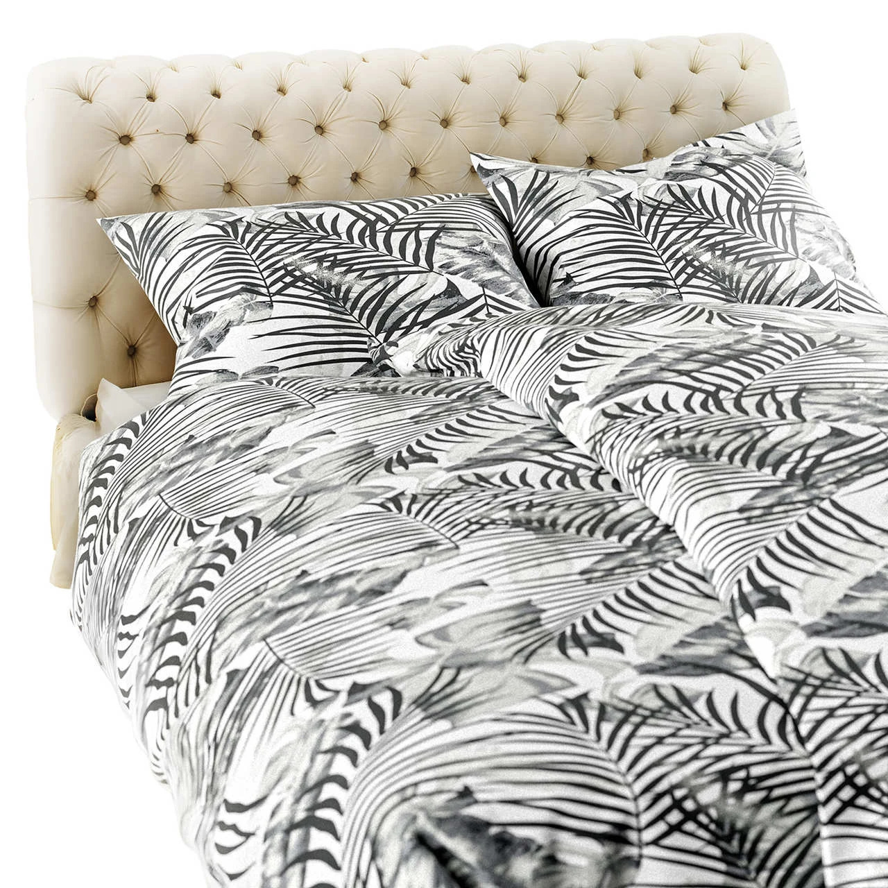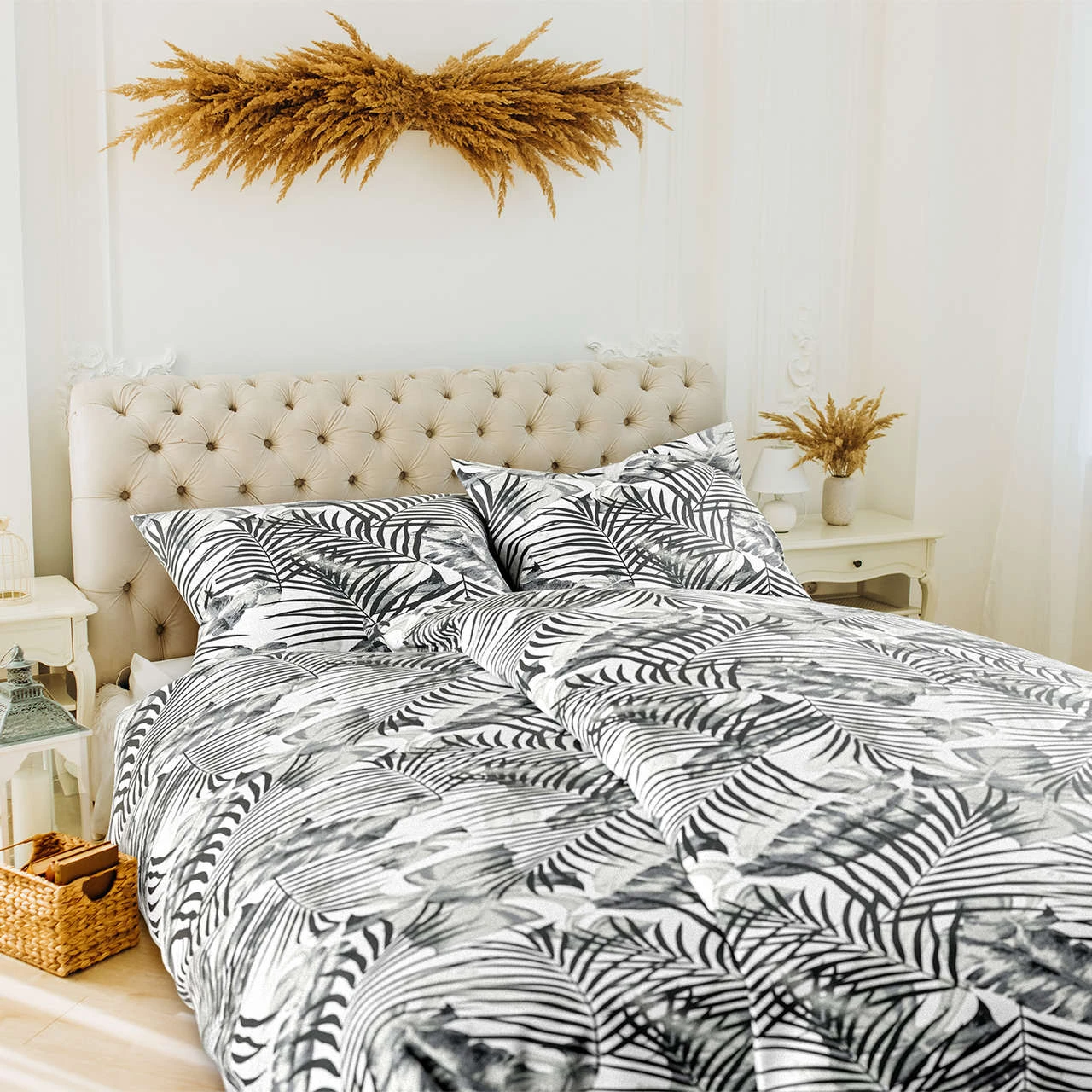 Zanurz się w tropikalnej atmosferze z pościelą flanelową JUNGLE w rozmiarze 200x220 cm. Ta piękna pościel w kolorze białym z szarymi liśćmi palmowymi przeniesie Cię w świat egzotycznych rajskich ogrodów.
