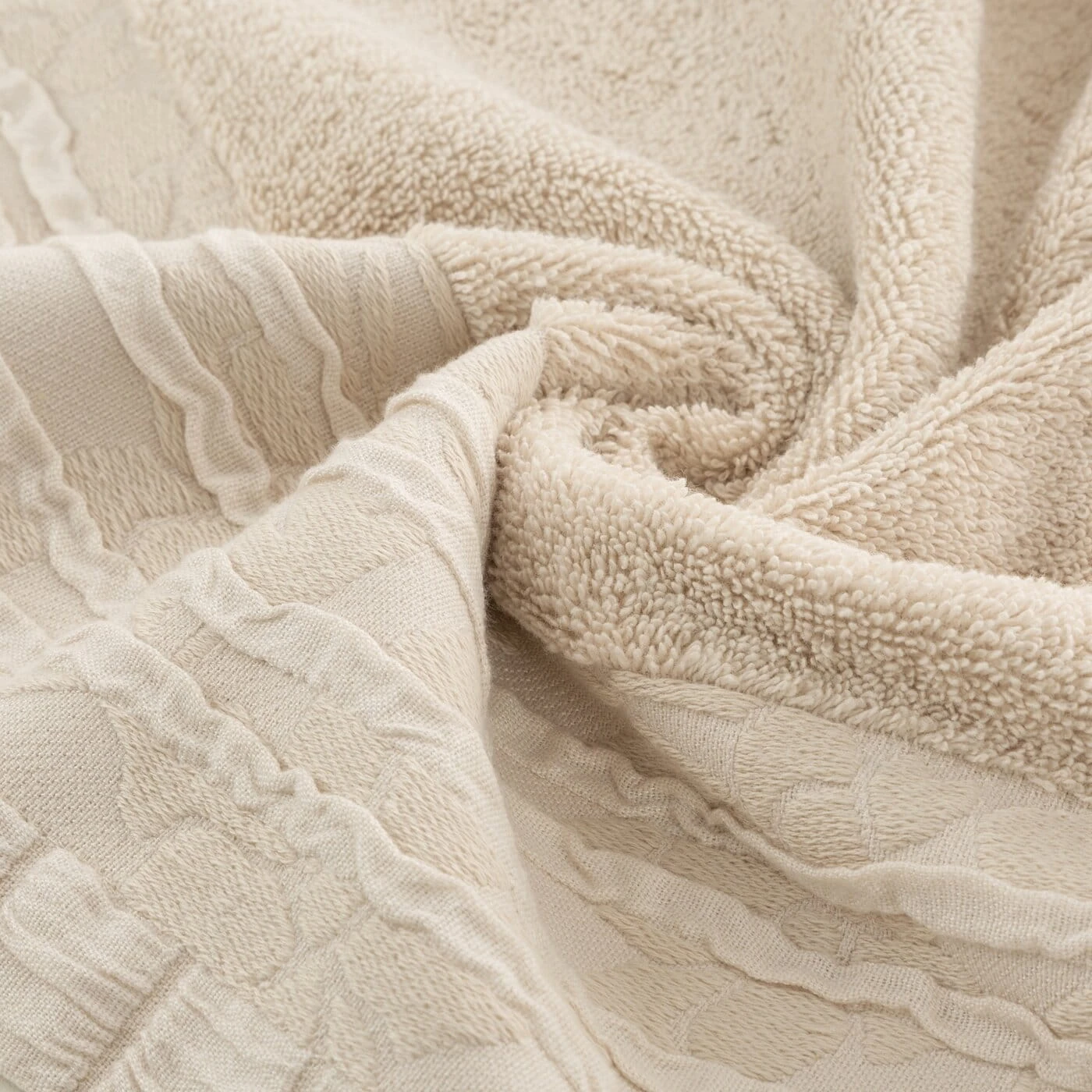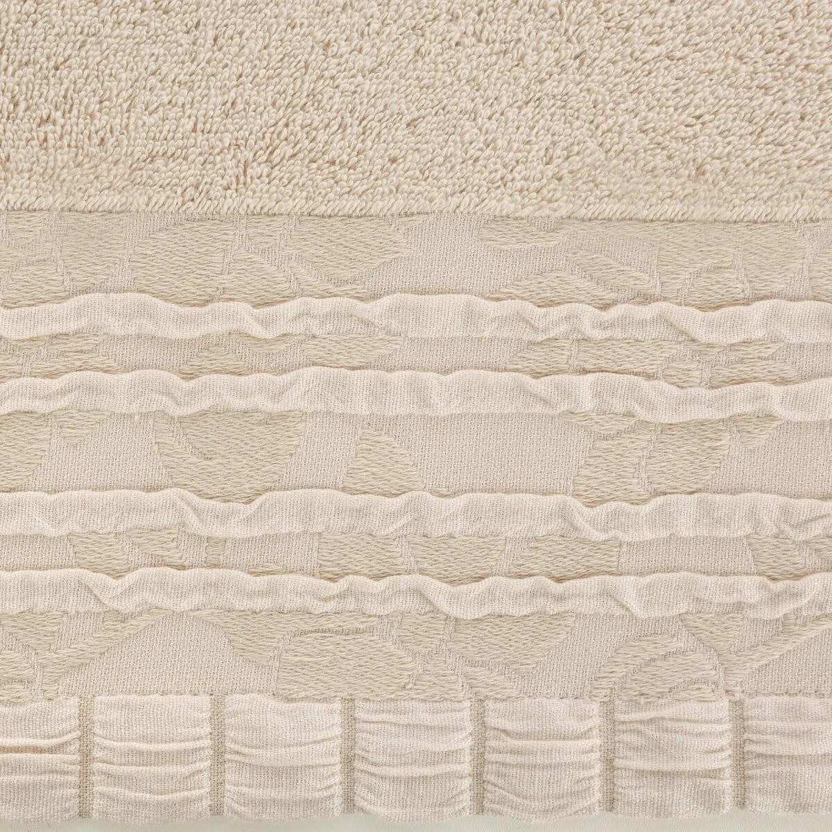 Ozdobiony został żakardową bordiurą w postaci kwiatów przecieranych poprzecznymi pasami, która jest przestrzenna i przypomina nieco "płótno", ale jest równie miękka i delikatna dla ciała jak cały ręcznik.