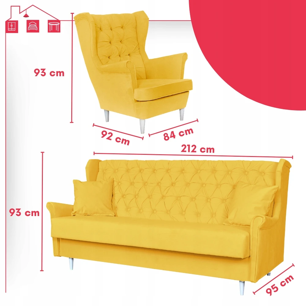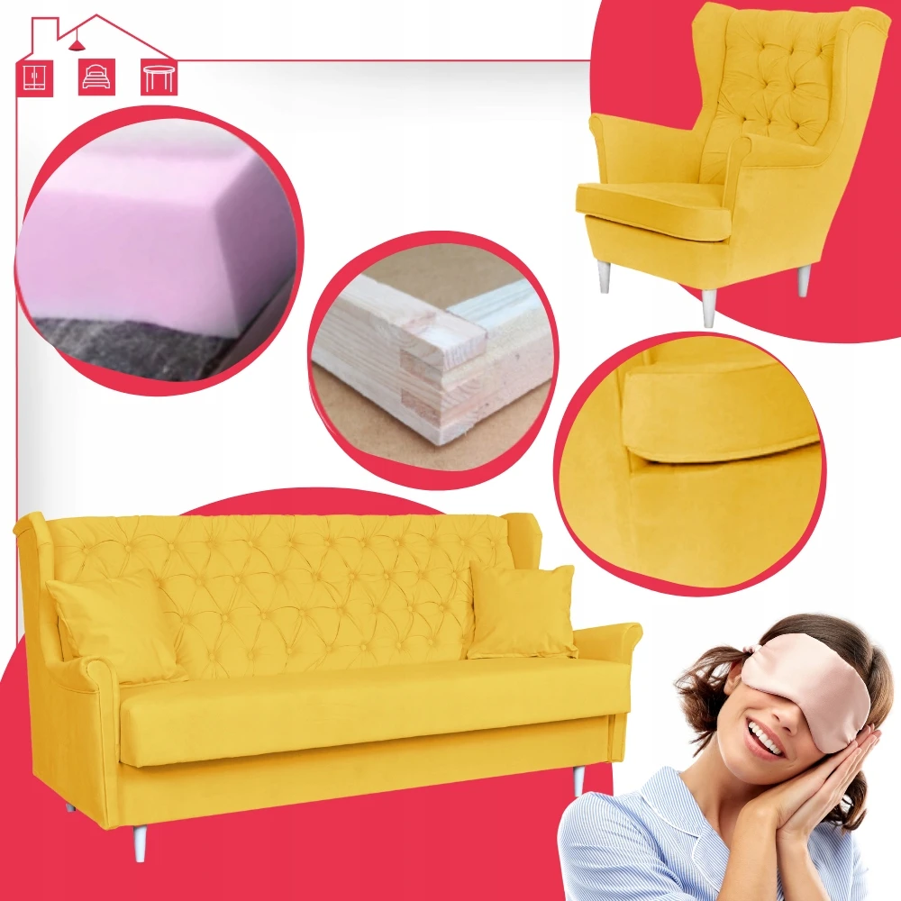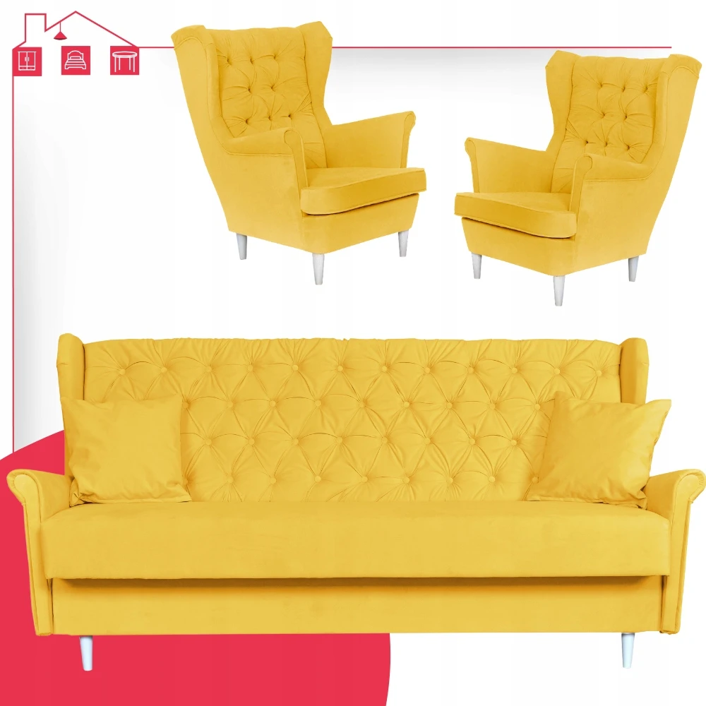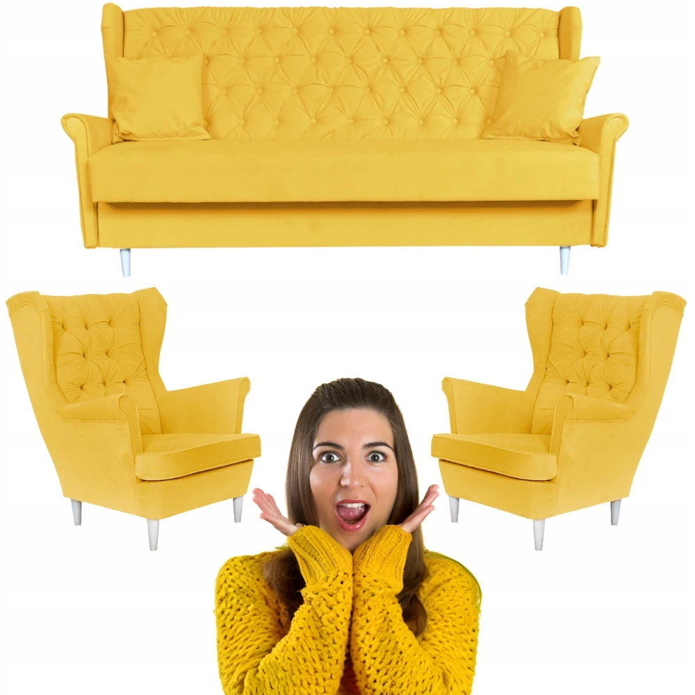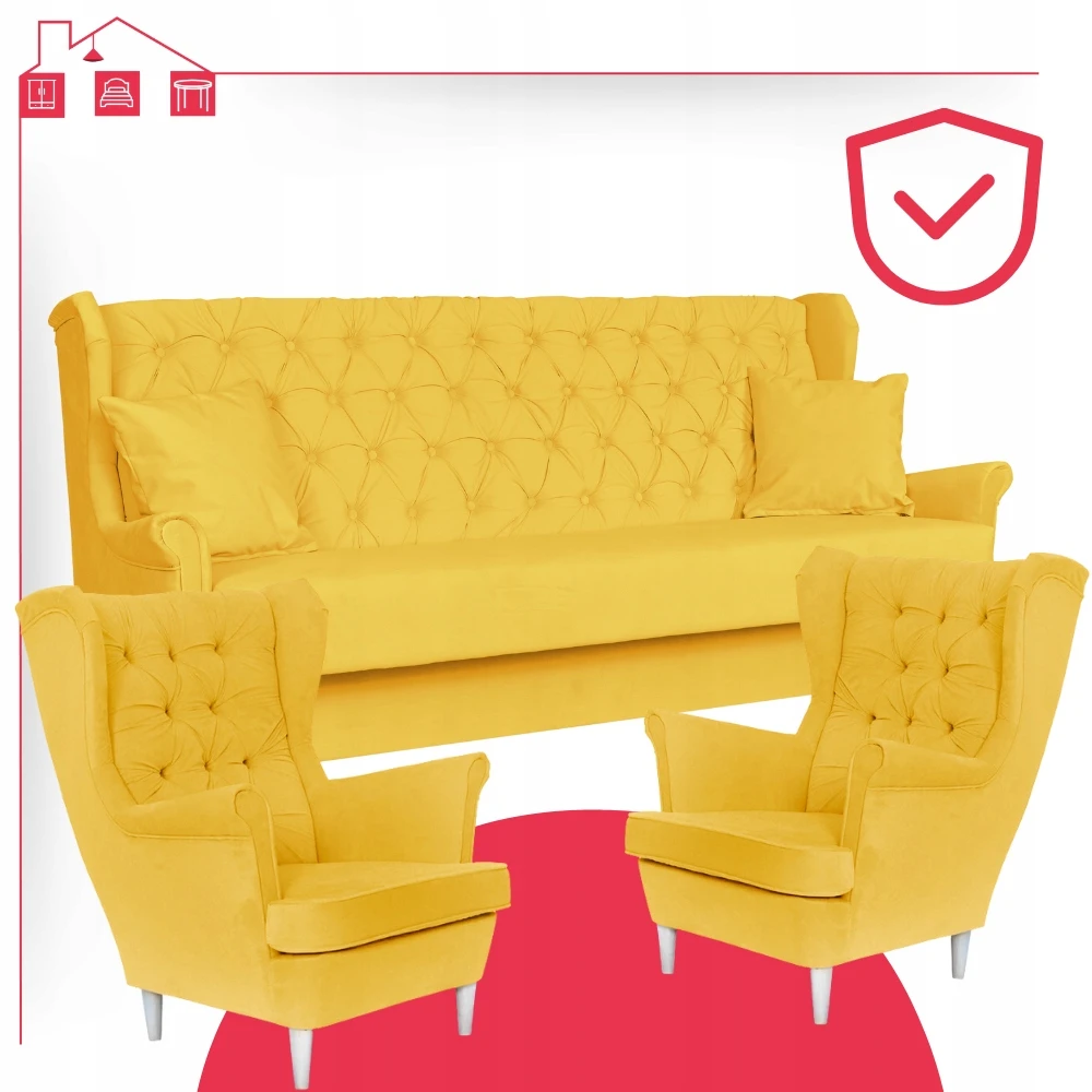 Rozkładany zestaw wypoczynkowy z wersalką fotele uszaki ŻÓŁTY Family Meble