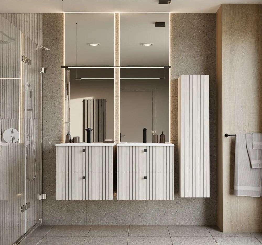- Nowoczesny ryflowany front – ozdobne pionowe frezy tworzą elegancki efekt dekoracyjny.
