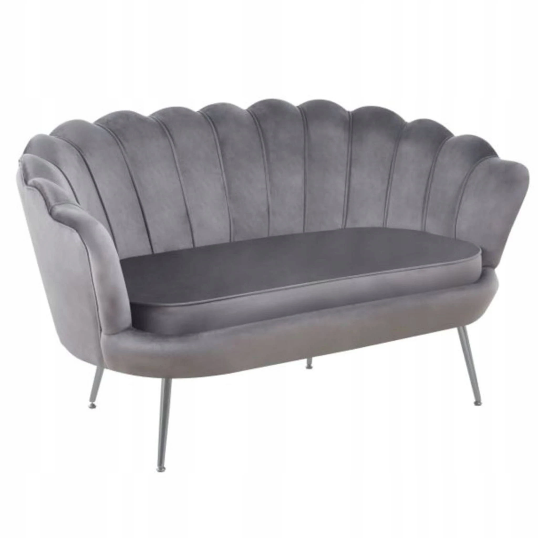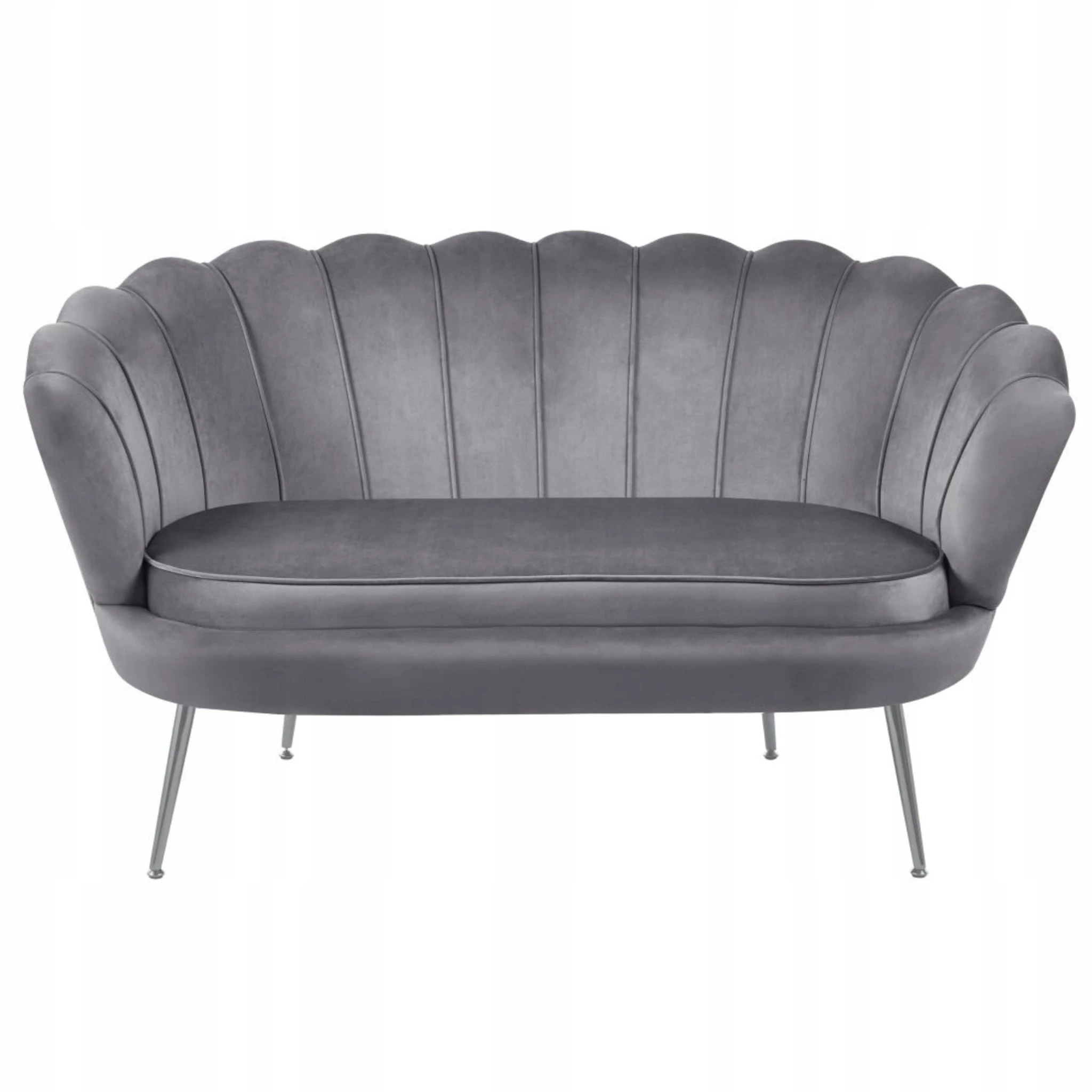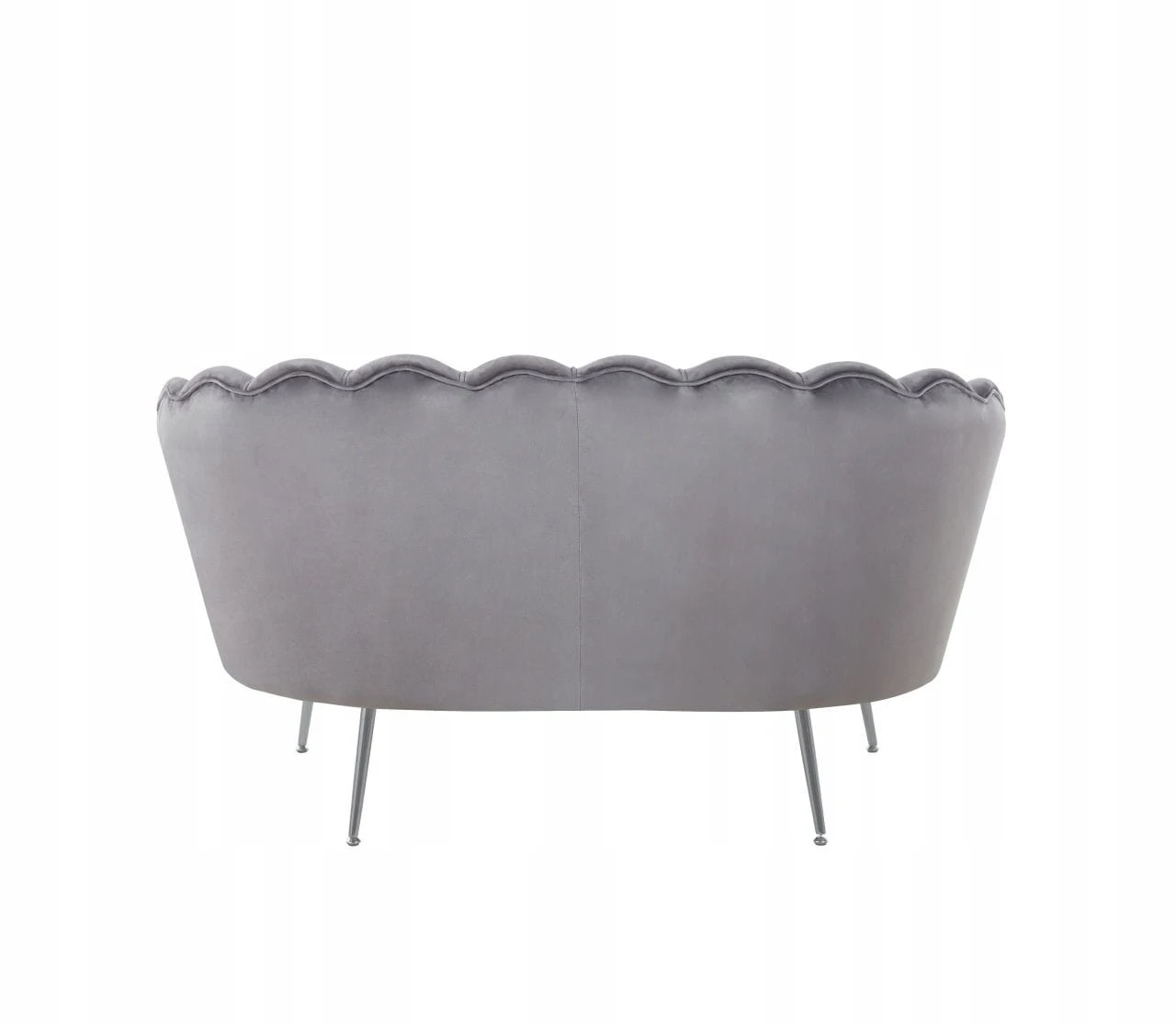 Obicie sofy wykonane jest z miękkiego weluru w odcieniu szarym, co dodaje jej przytulności i sprawia, że jest wyjątkowo miła w dotyku. Nogi sofy są wykonane z metalu w kolorze chromu , co dodatkowo podkreśla elegancję mebla. Poduszki siedziskowe są grube i wygodne, zapewniając komfort podczas siedzenia. Sofa ta idealnie wpisuje się w romantyczne lub glamour aranżacje wnętrz.