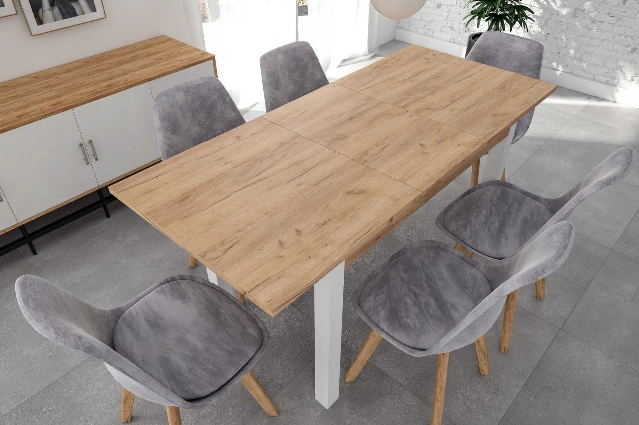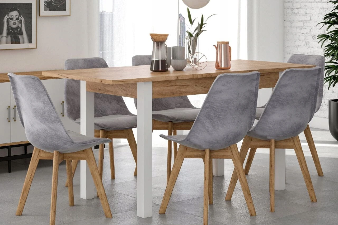 Stół kuchenny ST22-FX to kwintesencja minimalizmu – połączenie bieli z laminatem imitującym drewno tworzy uniwersalną kompozycję, która wpasuje się w większość wnętrz zastosowanie w małych kuchniach i jadalniach.