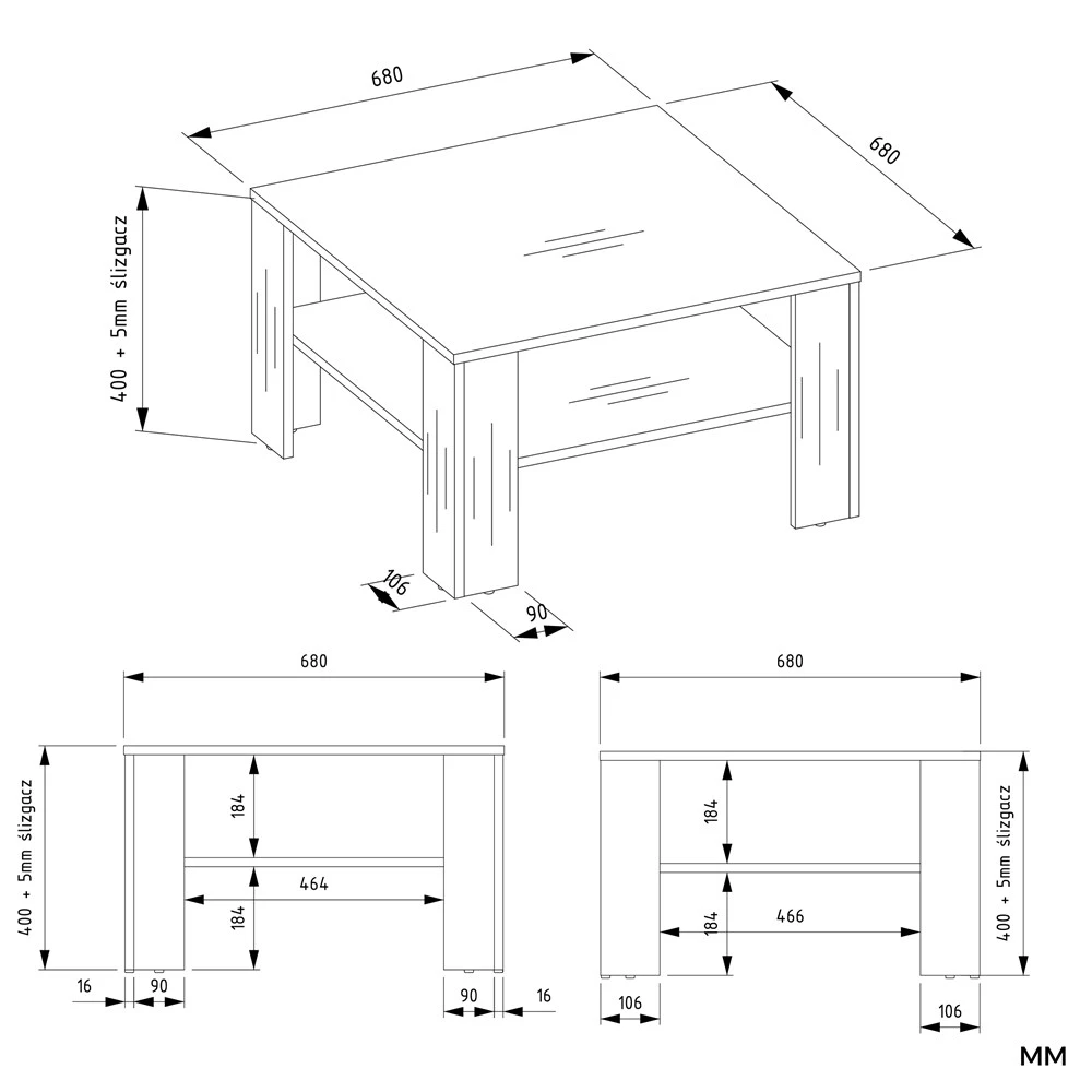 - Płyta wiórowa laminowana: o grubości 16 mm, wytrzymała i odporna na zarysowania.