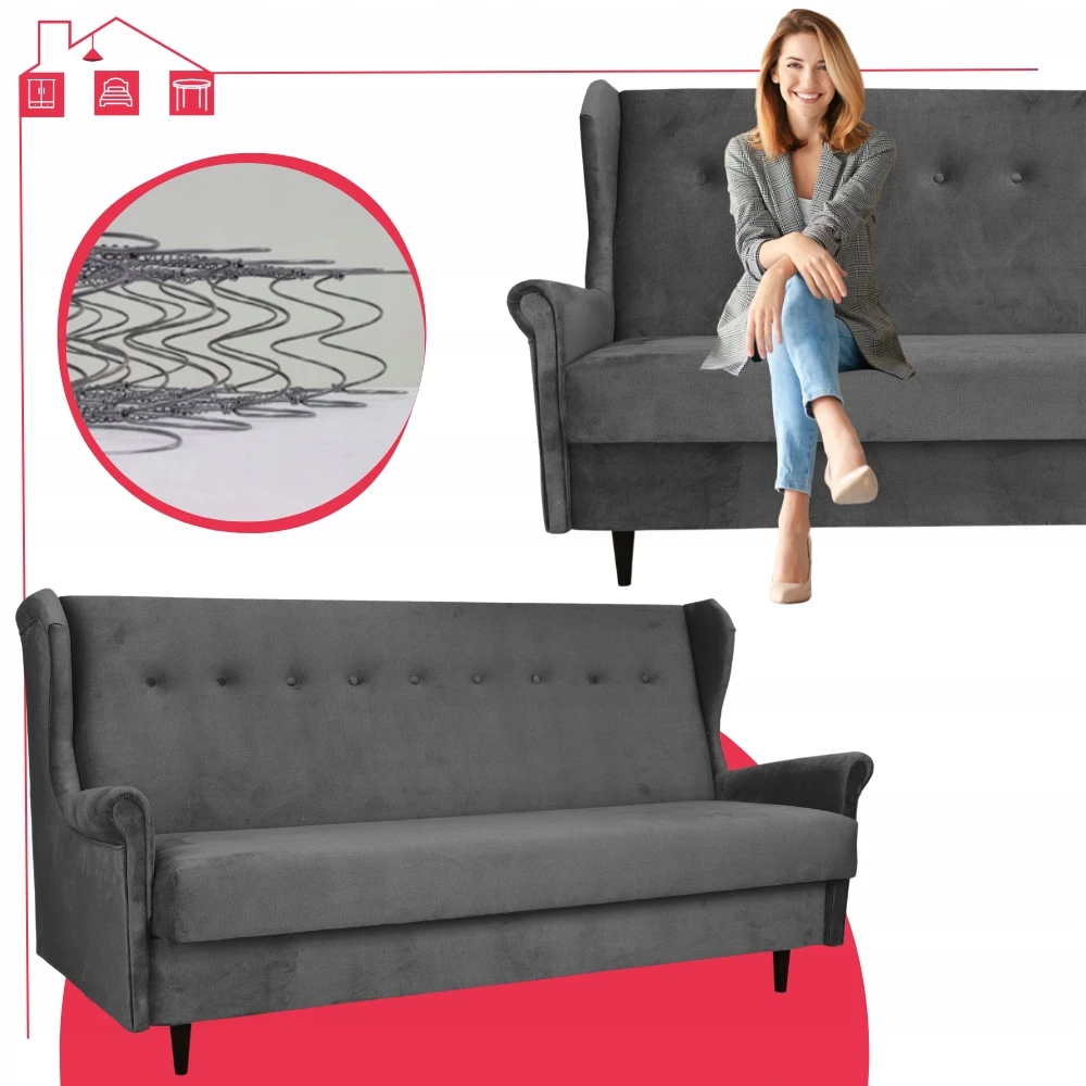 - Dodatkowe funkcje wersalki: funkcja spania, podłokietniki, pojemnik na pościel