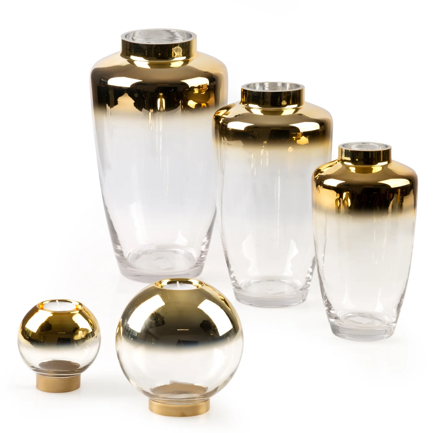 Dwubarwny złoty świecznik ZOJA w kształcie kuli, wykonany ze szkła artystycznego o lśniącej powierzchni, to efektowny dodatek do każdego wnętrza.