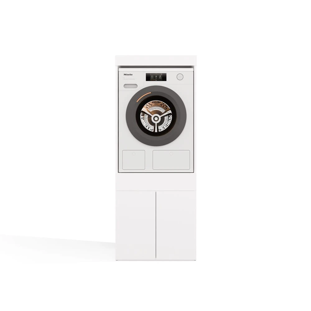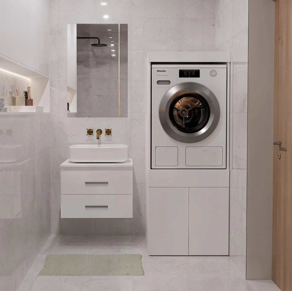 - Przestrzeń na pralkę lub suszarkę – stabilna zabudowa z otwartą wnęką