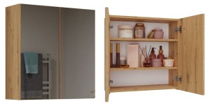 - Wyposażona w 3 praktyczne półki schowane za stylowymi drzwiczkami z lustrzanym frontem.